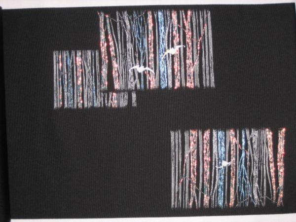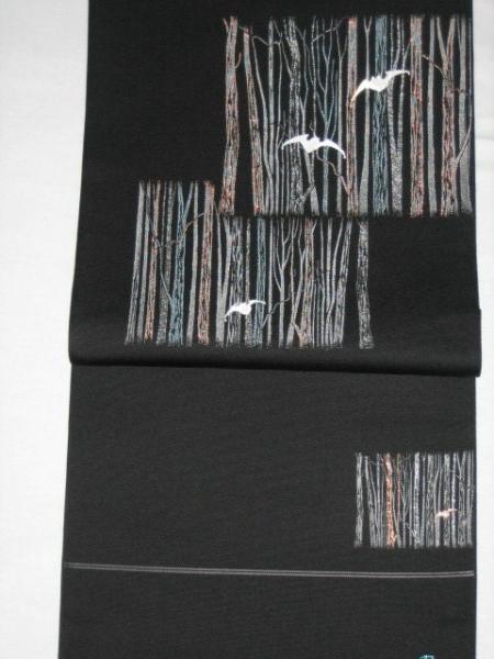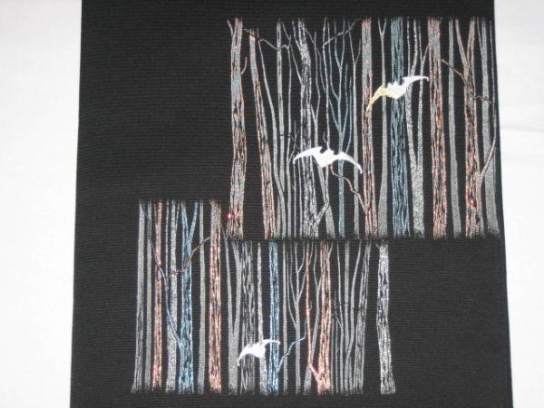 黒地に木立にこうもり、新品未仕立て、絹100%金属糸等使用 西陣山地証明証紙あり (柄はたれ、たいこ、前腹部) 有名メーカー帯ですがお安く出品です