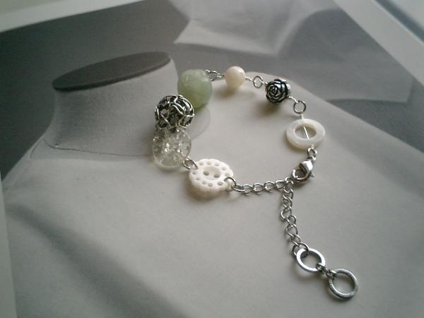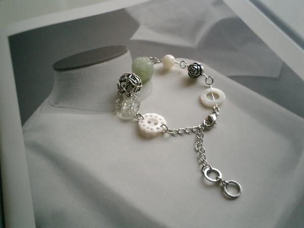 スローダンスシリーズです♪素敵な夢を見て!シェルと薔薇の繊細なブレスレットです♪デザイン違いのシェルと素材違いの薔薇を集めて可憐な表情です♪♪シェルは8ミリの丸玉や12ミリのコイン型です♪ニュージェイドの両面薔薇や8ミリのメタルチャームの薔薇、アンティークのガラスボタンやレース模様のシェルボタンを合わせてひっそりロマンチックしています♪やさしいオフホワイトのお色でまとめて大人っぽい可愛さです♪長さは全長22センチ位で調節自由です♪シンプルで飽きのこないいつまでも着けられるデザインを考えて作りました!お揃いのネックレスも出品しています。ハンドメイドをご理解頂いてノークレーム、ノーリターンでお願いします