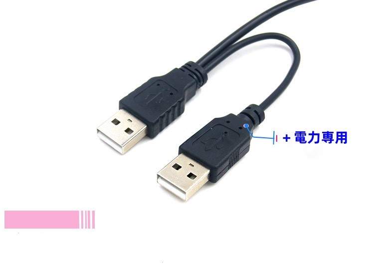 USBが二股になっていますので、安定した電源供給ができ、電力不足を防ぎます。(二股ケーブルの1つは、データ+電力、もう一つは、電力専用)