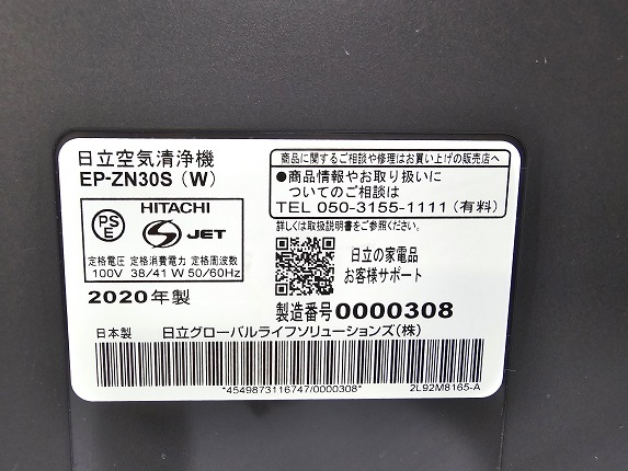 【中古品】 日立 HITACHI ファン式 空気清浄機 クリエア 最大適用床面積~15畳 EP-Z30S(W) 2020年製 ホワイト ○YR-17853○ の出品です。
