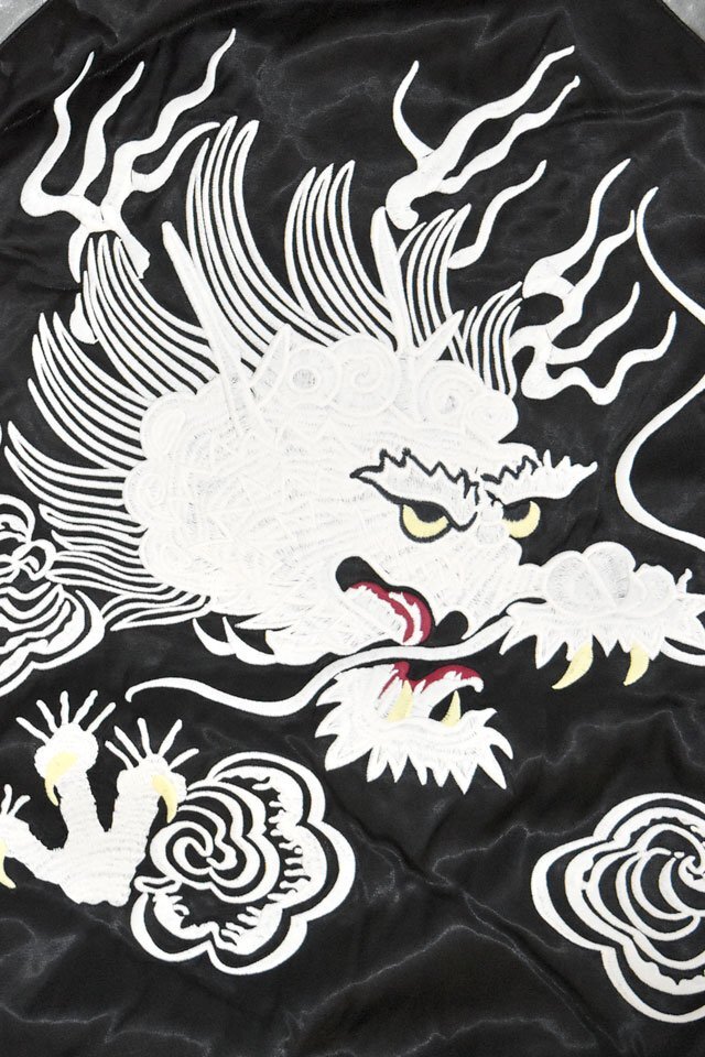 日本で初めてオリジナルのフライトジャケットを生み出し、その後も数々の国内製ミリタリー商品を製造する「ヒューストン」から、レーヨンスカジャン「DRAGON」/RAYON SOUVENIR JACKET(51526)のご紹介です。 HOUSTONのスカジャンシリーズから、ワントーン刺繍による通称ドラゴンヘッドがリリースされました。 袖の3本ラインと2パターンのリブ使いがよりビンテージ感を演出してくれます。 ちょっと変わったスカジャンをお探しの方にご納得いただけるアイテムです。 | ||||||||||||||||||||