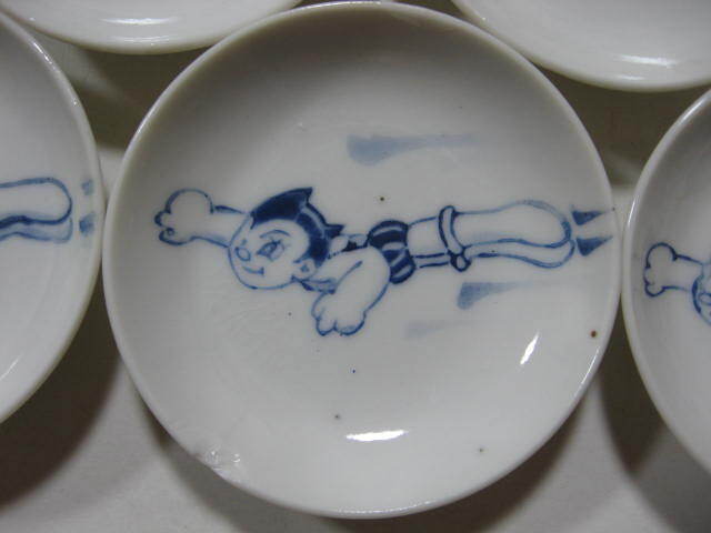 昭和33年 鉄腕アトム絵付け豆皿5客セットです、高台には統制番号岐333とともに日付S33.3と入っています、古い無地の皿を利用したのかもしれません(詳細不明)、状態は中古、経年の擦れ、汚れ、窯傷、高台ほつれ等ございます、大きさは約口径8.6センチ、この機会にぜひどうぞ。※新規、評価の悪い方は削除する場合がございます