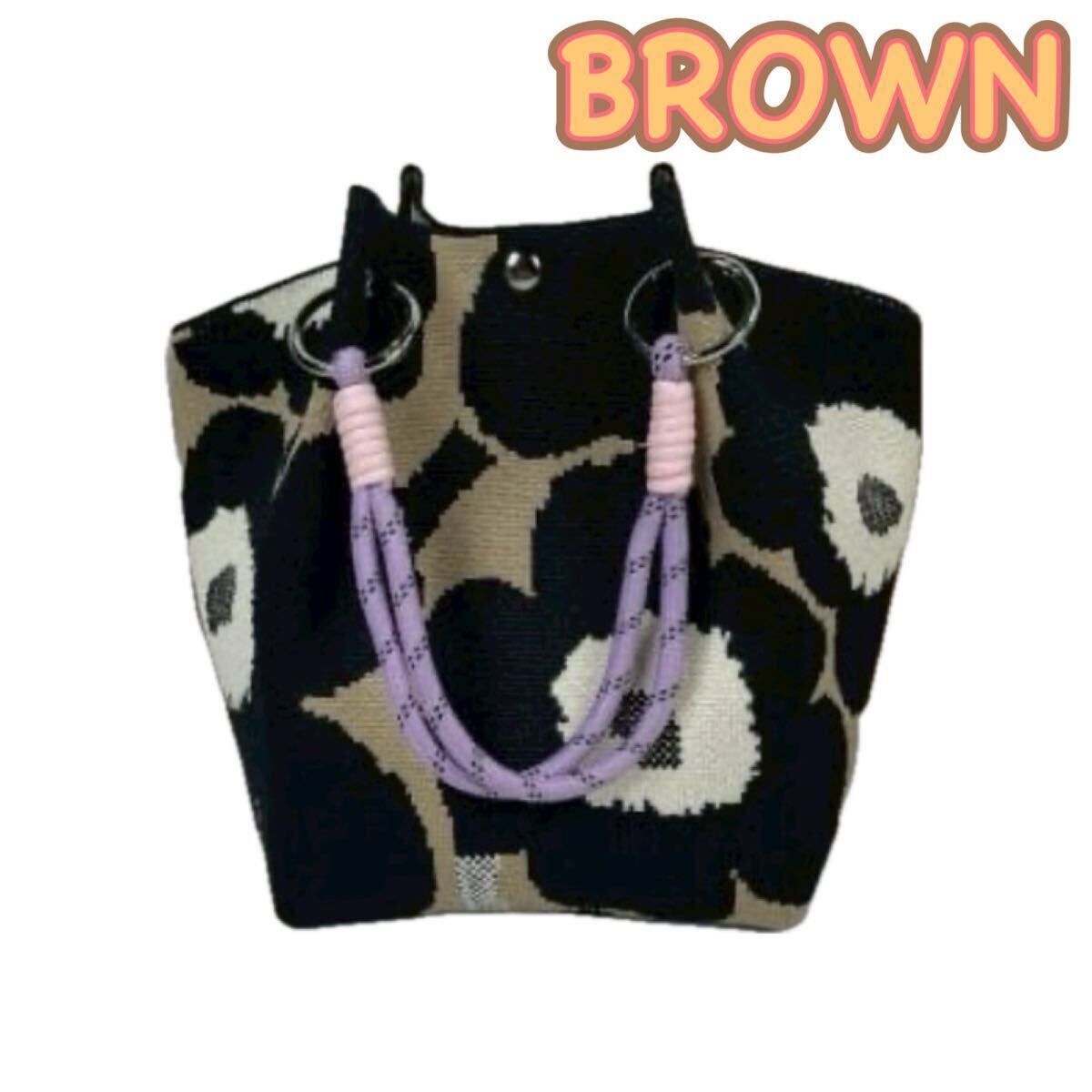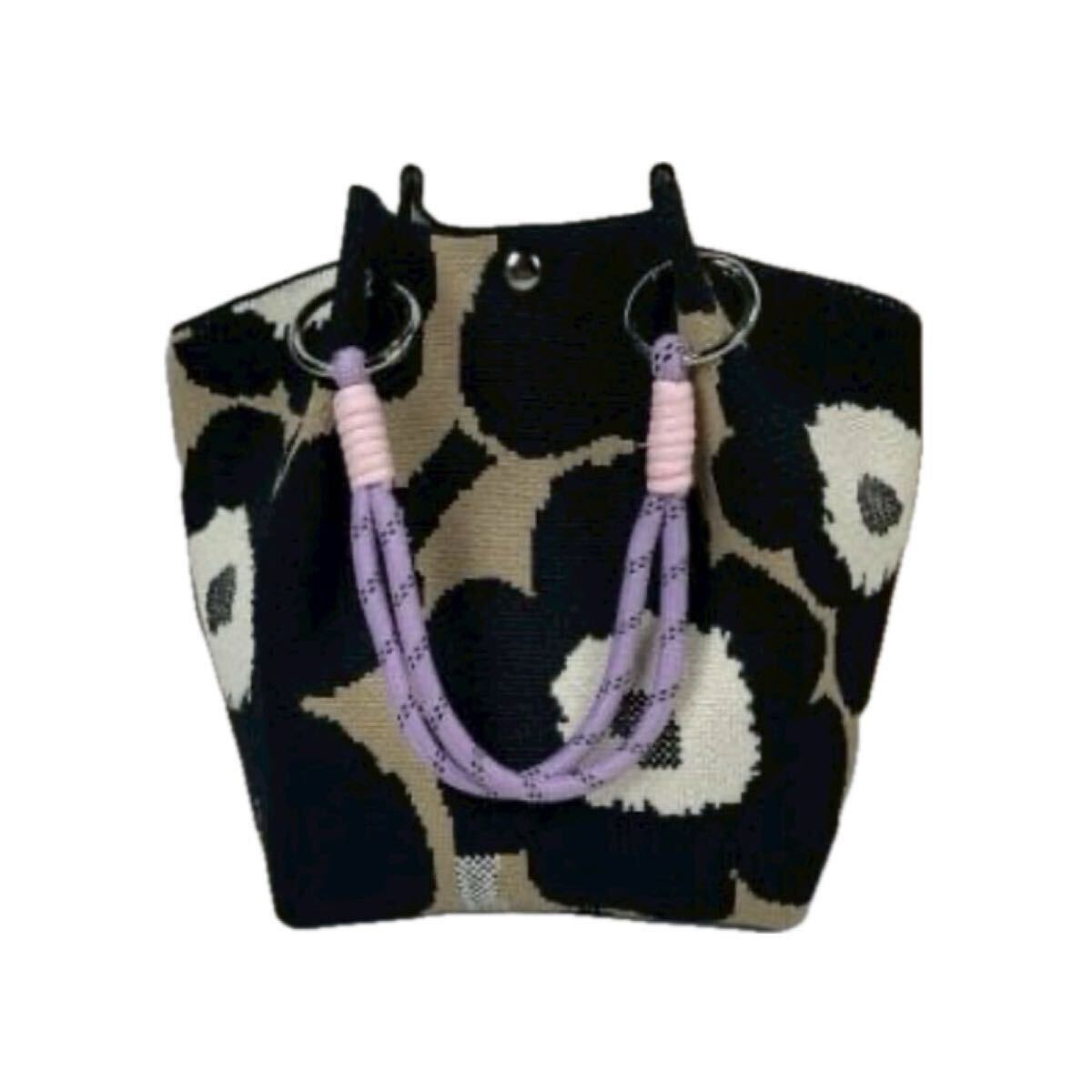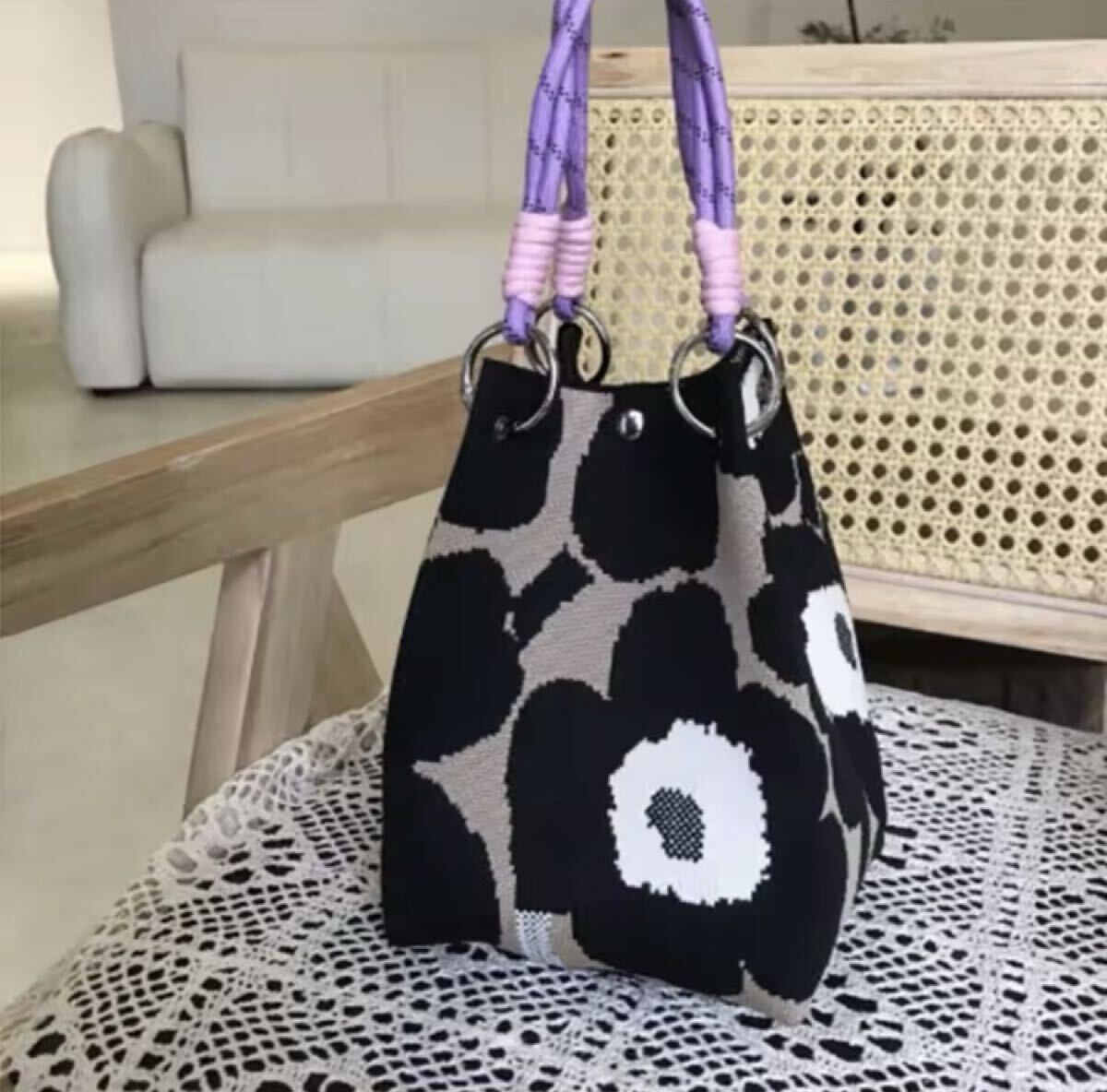 コードハンドルがおしゃれなニットのハンドバッグ。