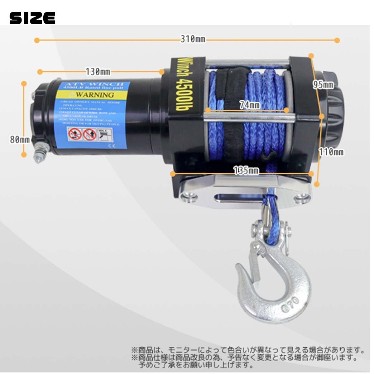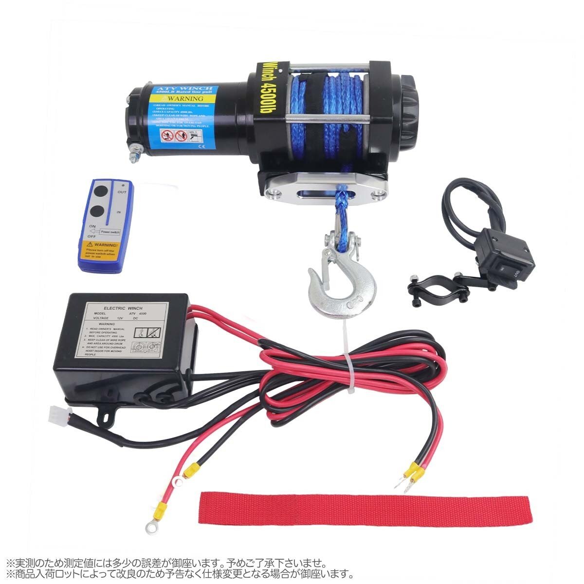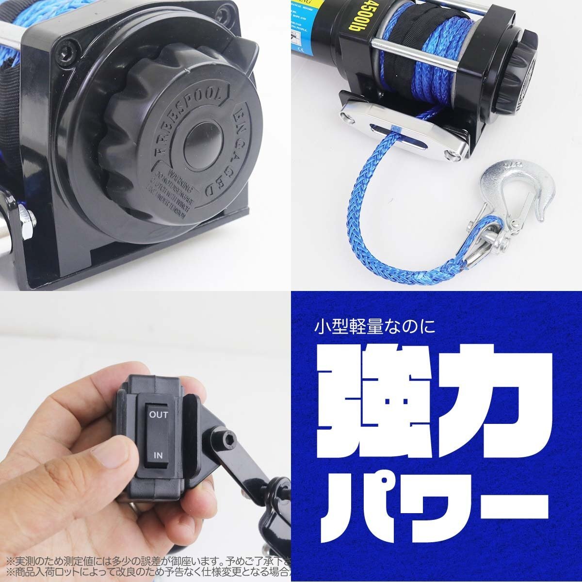 | 商品の詳細 | アウトドアレジャーや現場作業、キャリアカーの車載用ウインチ等、最大4500LBS(2040Kg)の牽引力で様々な用途での使用が可能です。 無線リモコン付きなので、車両から離れてのウインチコントロール、 牽引対象物側でのウインチコントロールが出来ます。 ★防水仕様 ※水没状態、豪雨等の条件下での使用はお避け下さい。 クラッチ機構付 【商品仕様】 ・最大牽引力:4500LBS(2040Kg) ・ダイニーマロープライン:シングルライン ・ロープ材質:ポリエチレン繊維 ・モーター出力:1.4kw/1.9hp ・減速比:153:1 ・定格電源: DC12V ・ドラム寸法:37mm×72mm ・ロープサイズ:直径5.3mm×長さ10m ・巻取りスピード無負担時:(約)3.3m/分 1000lbs:(約)2.5m/分 2000lbs:(約)1.1m/分 4500lbs:(約)0.8m/分 ・有線&無線リモコン付き ・全体寸法:310mm×120mm×106mm ・重 量:約9kg ・付属品: 固定金具など ・英文取扱説明書 ・PL保険加入済! ※本製品は水平に牽引する仕様のものです。上下の荷揚げはできません。 | |