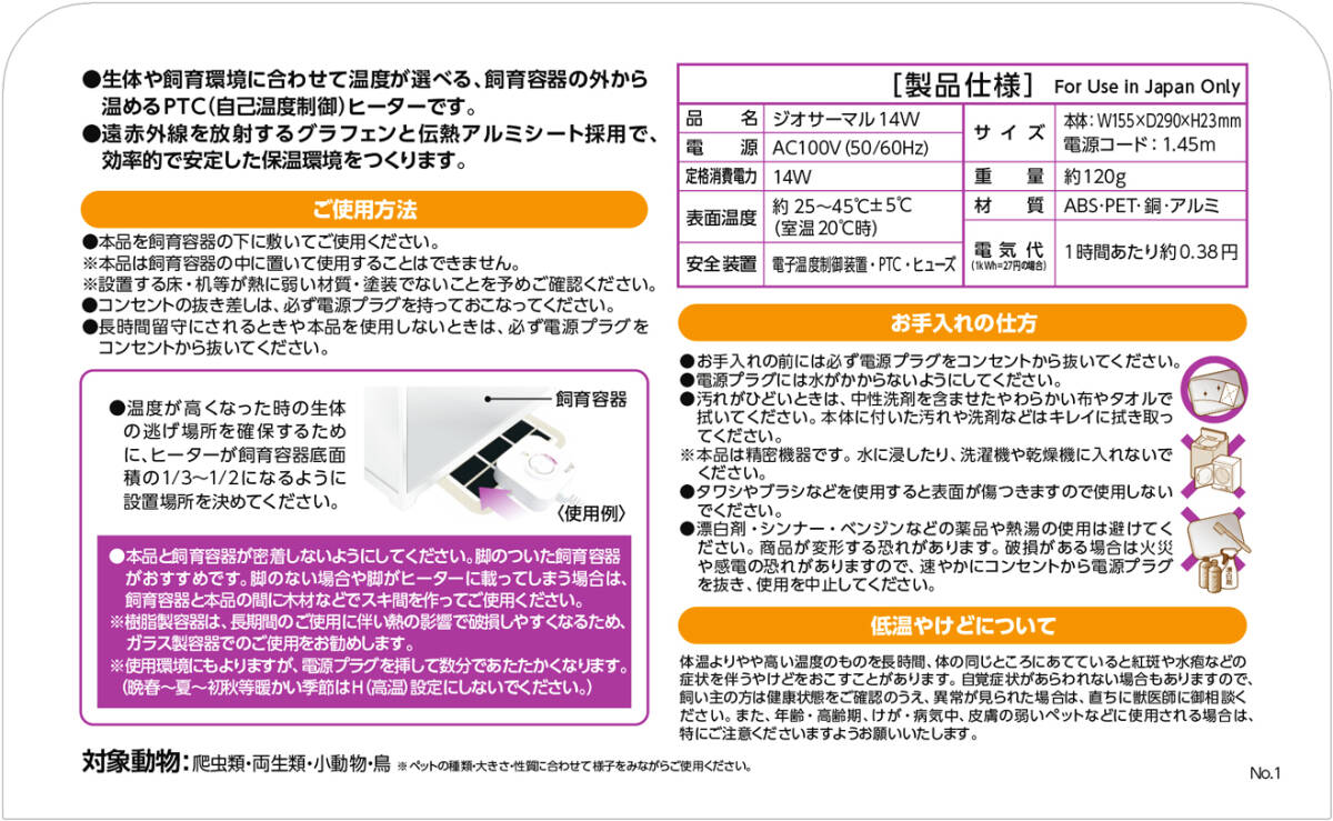 背面が伝熱アルミシートで覆われておるので、この背面がメタルラック等の熱伝導率が高い素材でできている棚にじかに触れると、というかじかに置くと、伝熱アルミシートの影響で棚にも熱が伝わり放熱してしまう恐れがございます。ショップなどでメタルラックを使っているお店が多々ございますが、あれはショップ全体を空調で温めているから全然問題ないのです。冬、暖房を付けていない部屋のメタルラック等を触ってみてください、ひじょーに冷たいです。そこに熱伝導率の高い伝熱アルミシート付のパネヒを直接敷くと、熱を棚全体にとられてしまうと思いませんか?そもそもヒーターは温度を上げるためのものなので、夏に熱くなる部屋の話は置いときますが、それも生体の好む温度と部屋の温度しだいだと思います。なお、棚とジオサーマルの間に保温材などを敷いて断熱して使用すれば、個人的には非常におすすめのパネルヒーターです!! メーカーにジオサーマル用の断熱材を作ってもらえるよう嘆願してみます。その断熱材が発売されたならば、マルカンさんは売上だけを考えるメーカーではなく、エンドユーザーさんの意見を聞き入れ、良い商品を作る良いメーカーとして、レプシーの商品をたくさん買うことで評価していただければ幸いです。