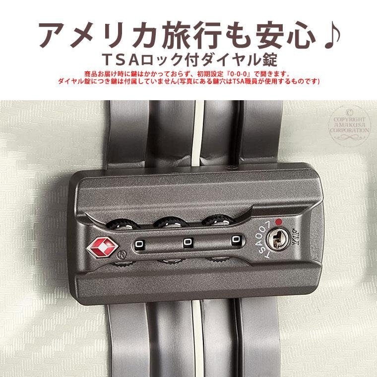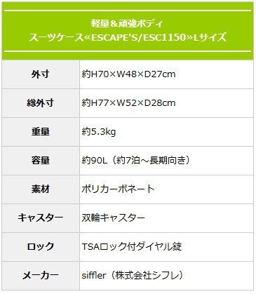 商品の製造過程や保管時にできた細かな傷や目立たない汚れがある可能性があります。 ご使用に際しては問題ございません。気になる方は入札をお控えください。 アウトレット品にご理解を頂ける方の入札をお待ちしております。 ポリカーボネート100%の軽量&頑強ボディに『日乃本錠前製双輪キャスター』や『TSAロック付ダイヤル錠』などこだわり機能満載! 快適な旅をサポートするスーツケース≪ESC1150≫