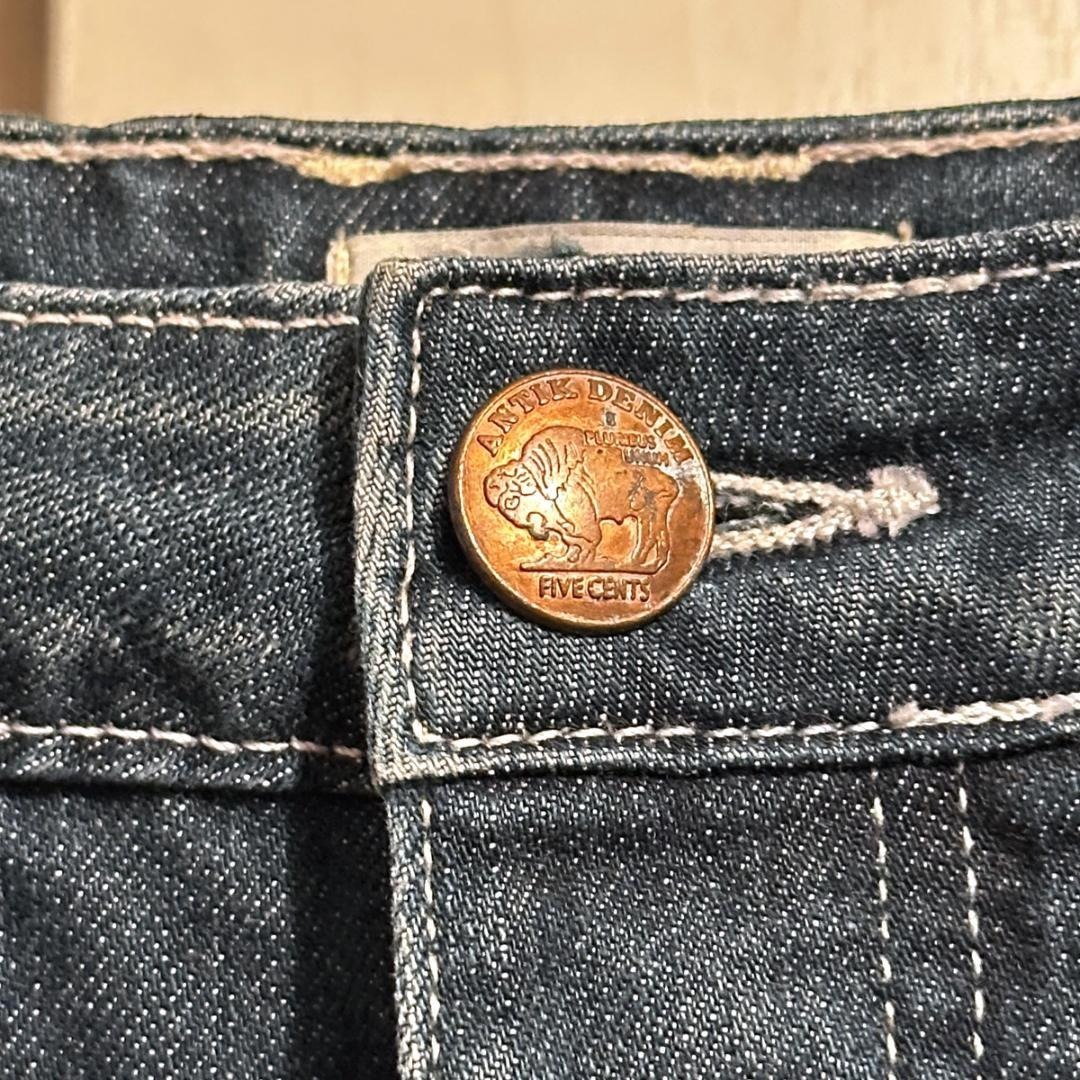 #ANTIKDENIM のデニムパンツです。深みのあるブルーに程よい色落ちが効いた一本で、フロント部分にはさりげないダメージ加工が施されており、こなれ感を演出。若干のフレアシルエットでカジュアルにもスマートにも合わせやすく、存在感あるコインボタンのデザインも特徴的です。