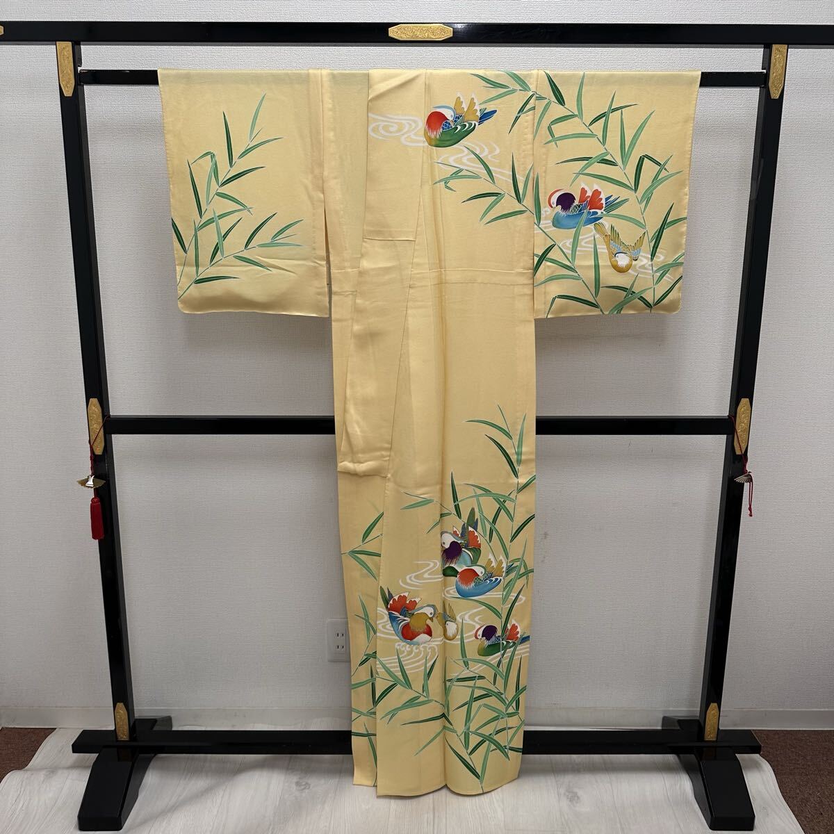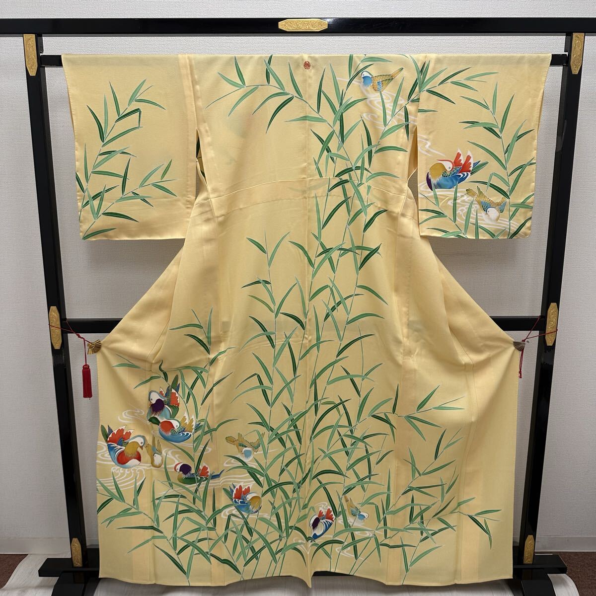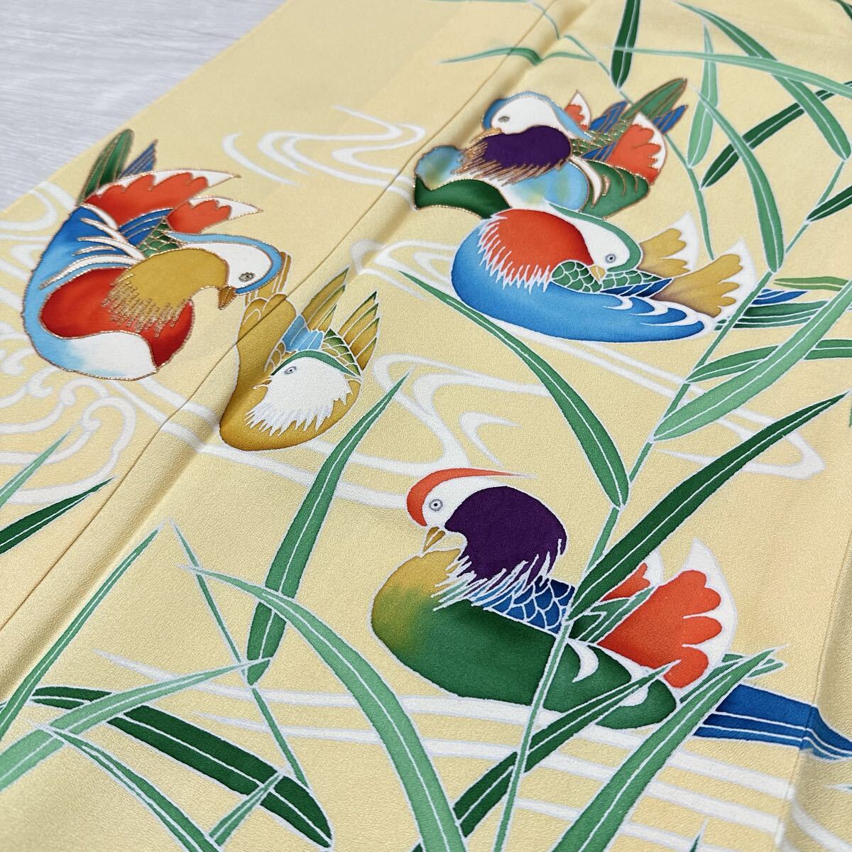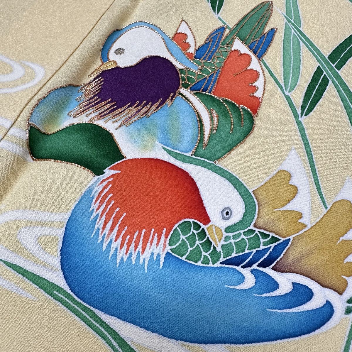 付下げ 単衣仕立て おしどり 可愛い黄色 着物 正絹 一つ紋 Q-196
