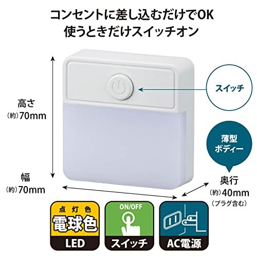 ミニマリスト・電球色 スイッチ式 NIT-ALA6PSQ-WL・・Color:電球色Size:スイッチ式Style:ミニマリスト・【 特 長 】 ご家庭の壁コンセントに差し込むだけの簡単設置です スイッチ式なので不要な時は消灯できます 耐トラッキングPSE新基準(平成27年1月16日改正)準拠・LEDを使用しているので長寿命、省電力です 30日間連続点灯でも電気代約10円(1kWh単価27円で計算) 薄型ボディー 点灯色は電球色LED・【 仕 様 】 電源:AC100V 50/60Hz 消費電カ:約0.5W 使用光源:LED3灯(交換不可)/電球色 全光束:約45 lm 本体寸法:(約)幅70×高70×奥行40mm(プラグ含む) 質量:約54g ※屋内用。屋外や浴室など湿気の多い場所では使用しないでください。・[R]炊飯方式: ミニマリスト●ご家庭の壁コンセントに差し込むだけの簡単設置です ●スイッチ式なので不要な時は消灯できます ●耐トラッキングPSE新基準(平成27年1月16日改正)準拠 ●LEDを使用しているので長寿命、省電力です ●30日間連続点灯でも電気代約10円(1kWh単価27円で計算) ●薄型ボディー ●点灯色は電球色LED