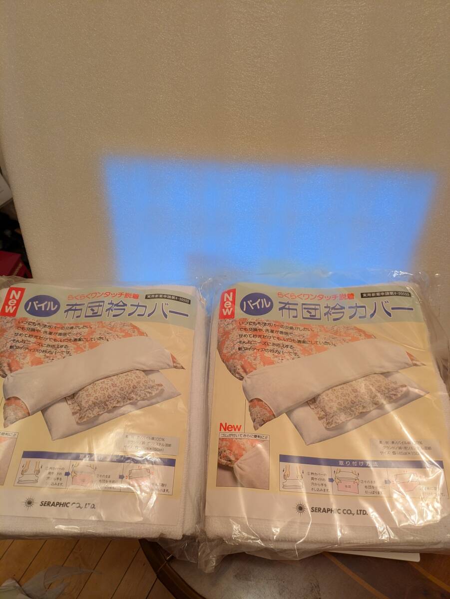 布団襟カバー未開封品ですが長期保管品につきシミ、汚れあるかもです。2枚セットになります。ノークレームでお買い上げの方にお譲りいたします。郵パック着払いでの発送になります。