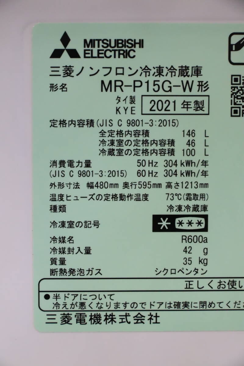 あ//はH0013 【2021年製】 MITSUBISHI. 三菱 冷凍冷蔵庫  146L. MR-P15-W 動作品