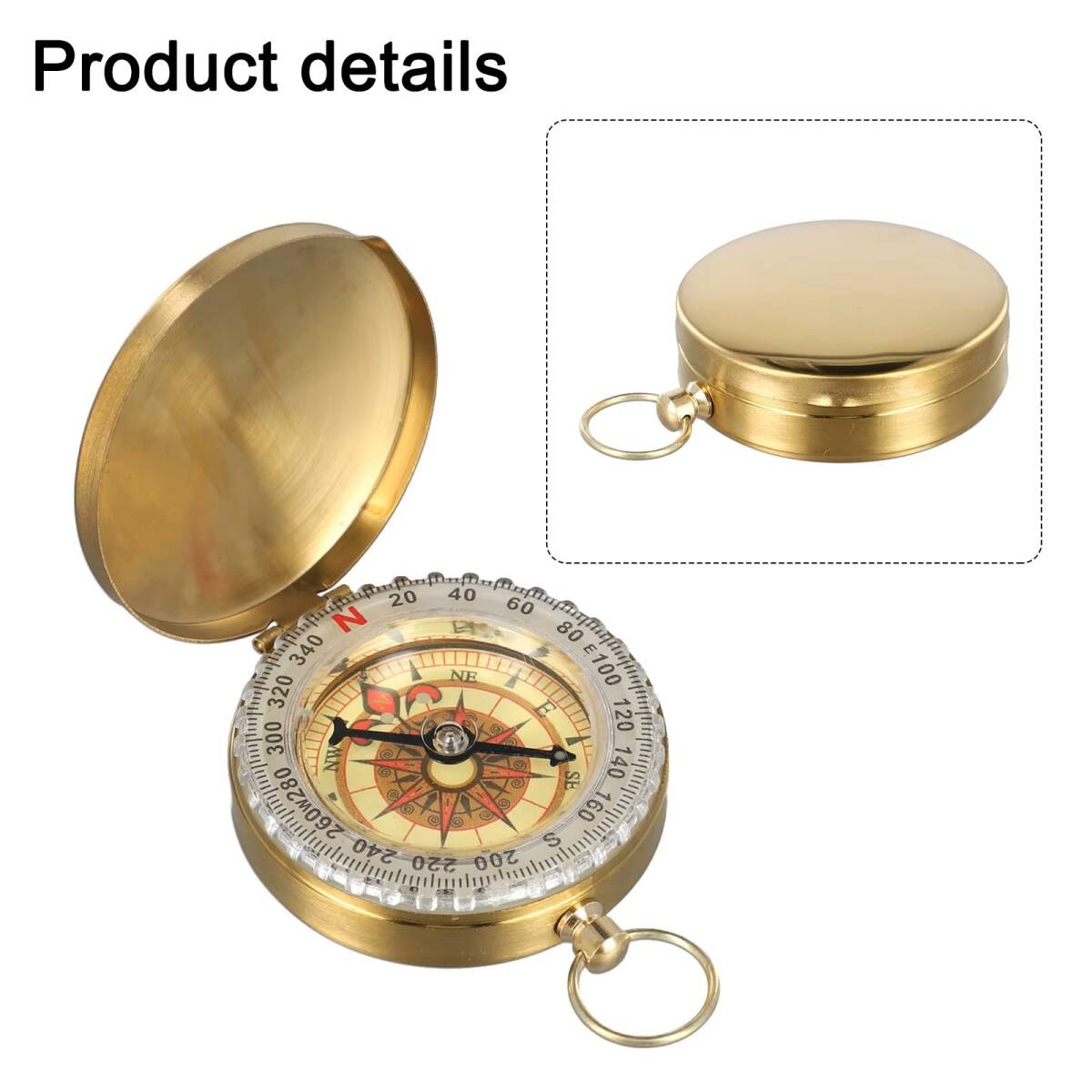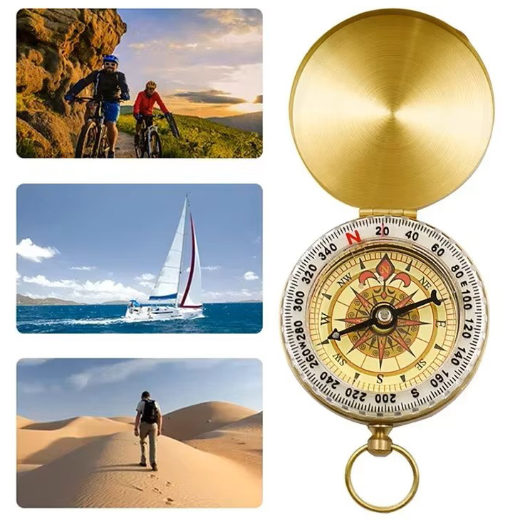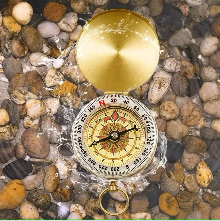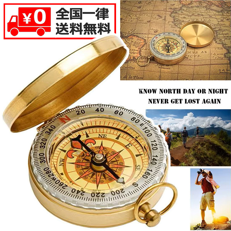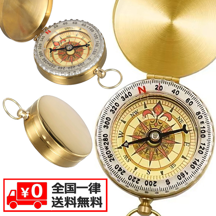 ★ ポケット コンパス / カバー付 銅製 / 方位磁針 方位磁石 / 登山 ハイキング ポータブル ゴールドカラー ★ 送料無料 ★