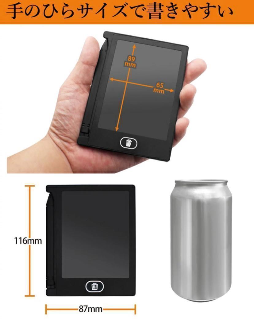 今話題のおすすめ商品!サイズ→持ち運び簡単メモらくちん4.4インチ116mmx87mmx5mm軽量モデルなので、だれでも手軽に使えます!【ワンタッチボタンを押すだけで書いたものを瞬時に全部消去】ゴミ箱ボタンで簡単に書いたものを消せます。間違って消さないためのロックボタンも裏についています。タッチペンも付属しているので、漢字などの練習やメモ、子供の学習、様々な用途で利用可能です!ペーパーレスで経済的&環境にやさしい。【今までになかった画期的なアイテム】今までメモ帳を使って使い捨てで環境にも悪かったものがこれからはデジタルで利用可能!様々な場面でプロの画家なども多数愛用の必須アイテム。【商品詳細】材質:LCD・ABS書いて消せる電子メモ帳大画面電子メモパッド消去ロック機能付き電子パッド電池交換可能デジタルメモ繰り返し使えるメモタブレット筆談ツール子供のお絵描き伝言ボード8.5インチ(黒)#プレゼント#エコ#メモパッド#勉強#お絵かき#筆談#介護#筆談ボード#ペーパーレス#writing_tablet#新品#落書き#汚れない#eco#入園#お出かけ#持ち歩き#便利#知育玩具
