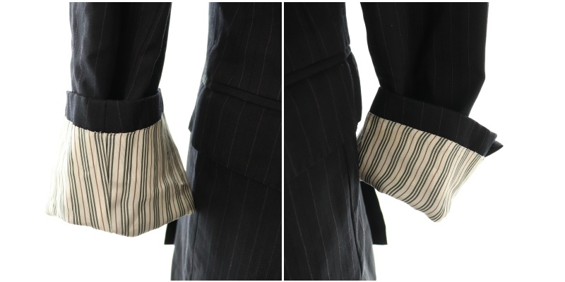 【状態】パンツに使用感、右前に引っ掛け及び後ろポケットのボタンが欠損しています。 また、パンツホック周りにほつれ、股に穴及びジャケット両袖口内側に汚れがあります。 ※全体的に中古品としての使用感と上記のようなダメージがありますが、通常使用には支障のない商品です。掲載写真や記載内容をご確認いただき、御理解の上ご購入ください。