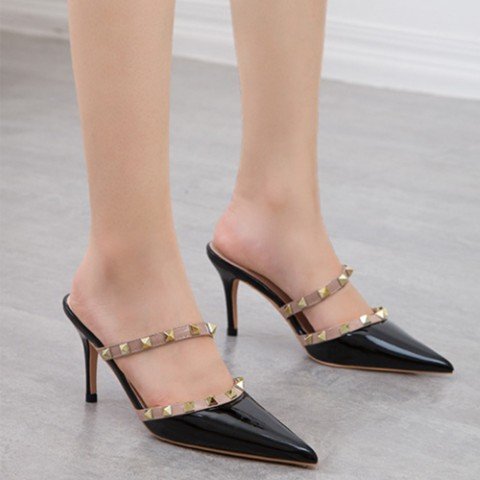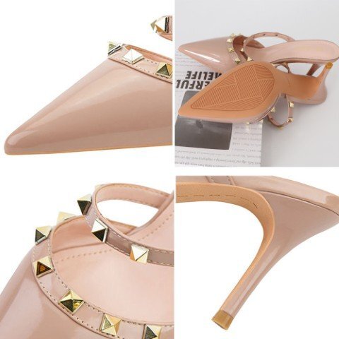 ミュールサンダル リベット ヒールサンダル ポインテッドトゥ 美脚結婚式 靴 パーティー 大人可愛いシューズ エレガント