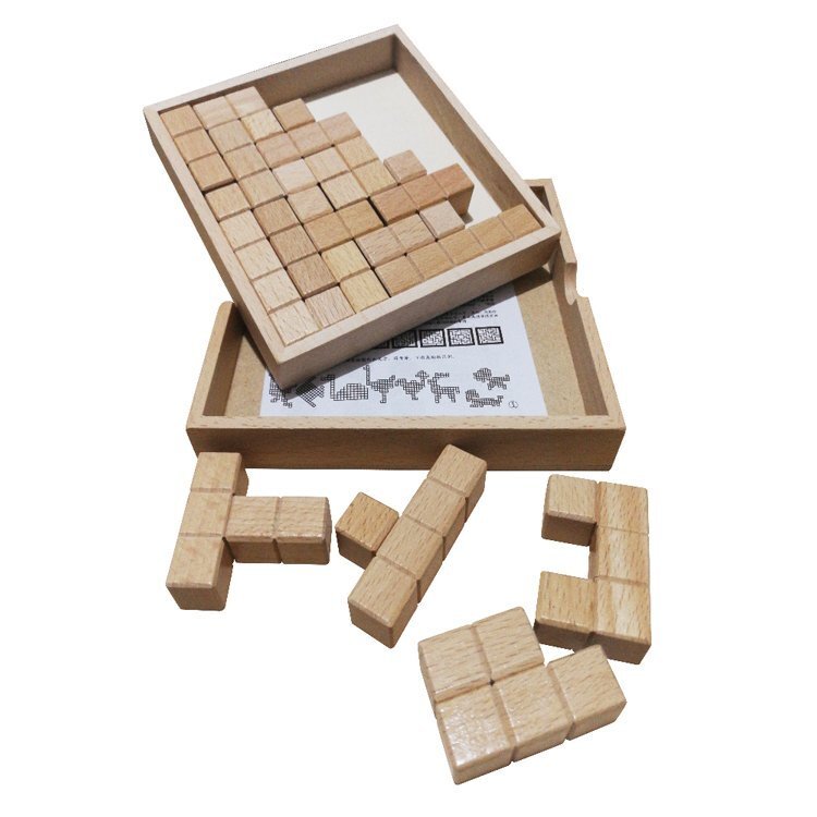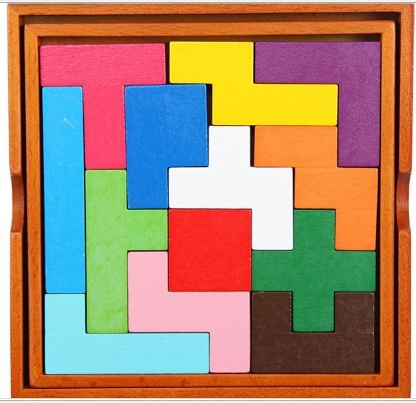 いろいろ形をした13個のピースを組み合わせる木製パズル。