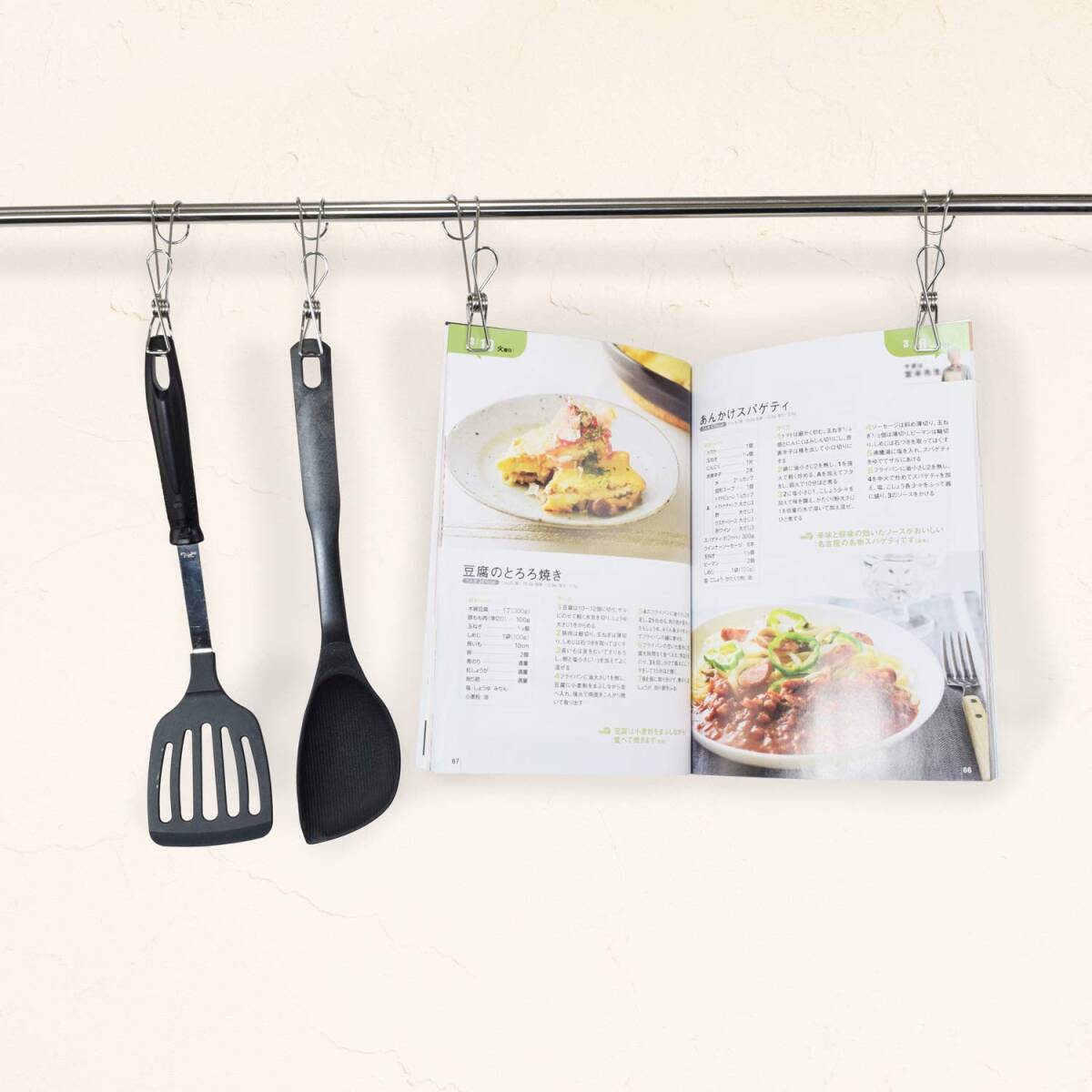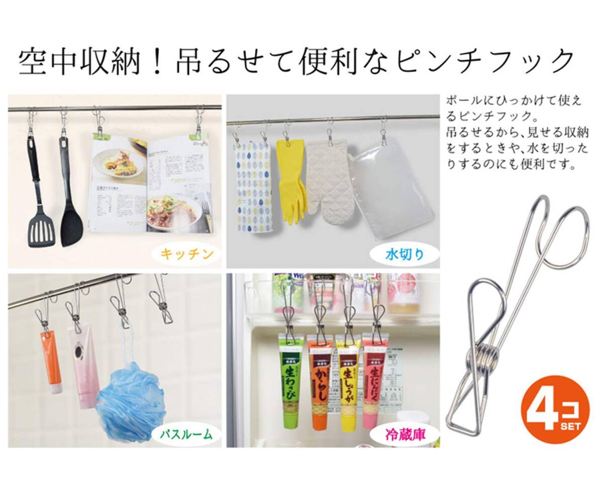 商品紹介 ●吊るして収納できる便利なピンチフック●ポールにひっかけて空中収納!ステンレスで錆びにくいからいろんな場所で使用できます。●キッチンツールやレシピを吊るしたり、クロスやゴム手袋・ミトンを吊るしたり(キッチンまわり)●洗顔チューブやタオルを吊るしたり(バス周り)●冷蔵庫でごちゃつきがちなチューブ類の整理に 原材料・成分 18-8ステンレス