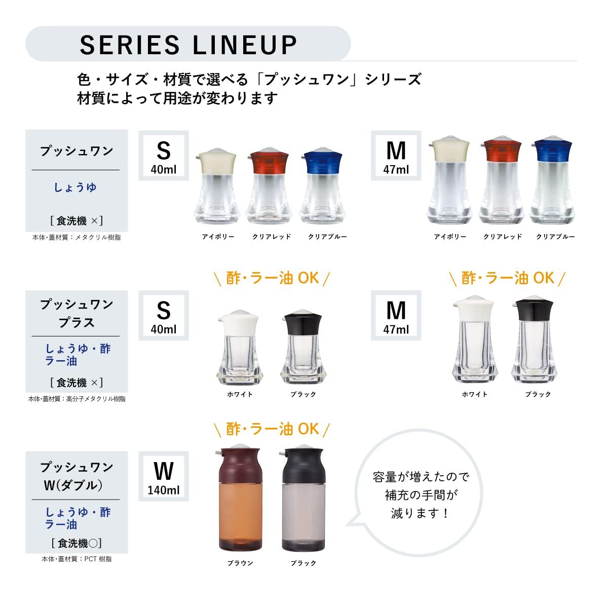 商品紹介 ●一口サイズの食べ物に一滴づつ出せる ●上のボタン部を押すとワンプッシュで0.4CCの醤油が出る ●押し加減でさらに微量の調節ができる ●倒れてもこぼれにくい押し出し式 ●少しづつ出せるので減塩を気にする方にお勧め より ●一口サイズの料理にピッタリ減塩 ●本体を傾けてから、上のボタン部を押すとワンプッシュで約0.4ccの醤油が出せる ●漬物やおひたしなどちょっとかけたい時に便利・少しずつ出せるので塩分を気にされる方にもお奨め 原材料・成分 本体:メタクリル樹脂(耐熱温度70℃~-20℃)、ボタン、パッキン:シリコン樹脂(耐熱温度120℃~-20℃)、パイプ:ステンレス