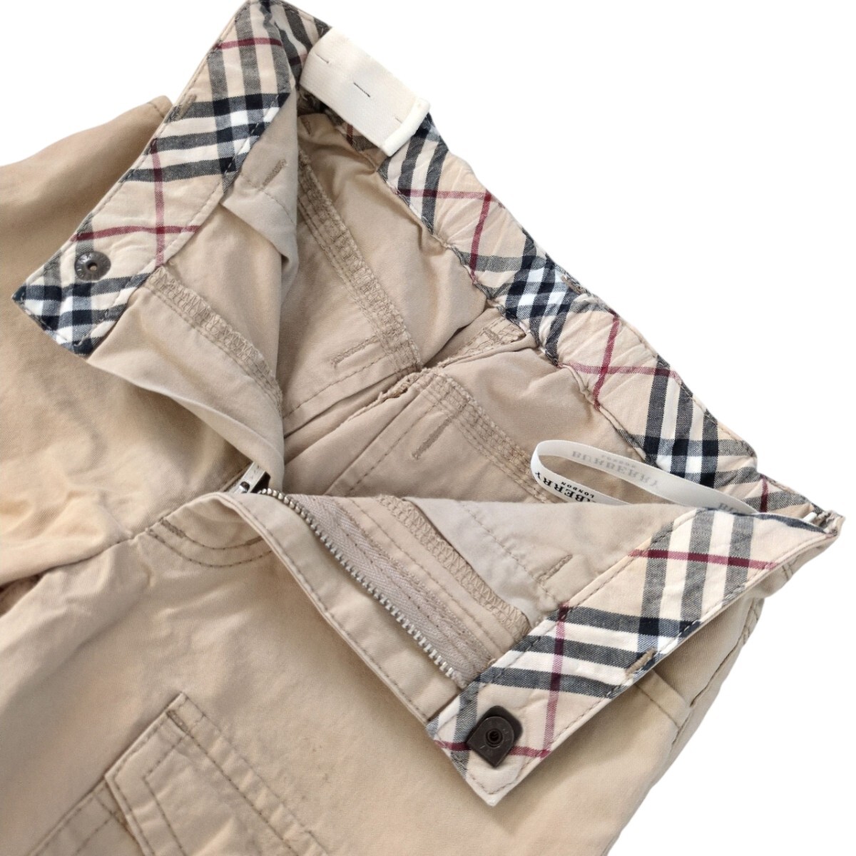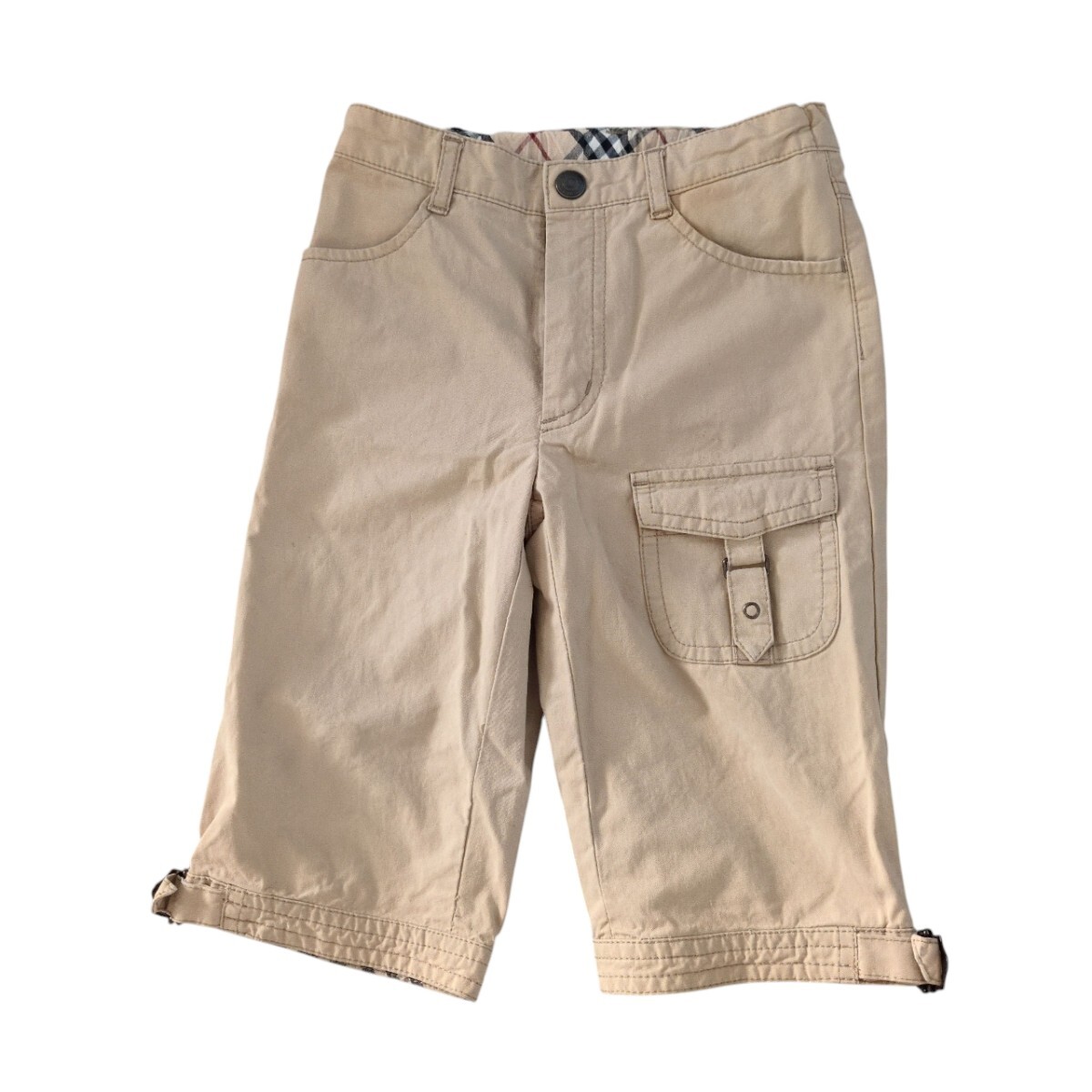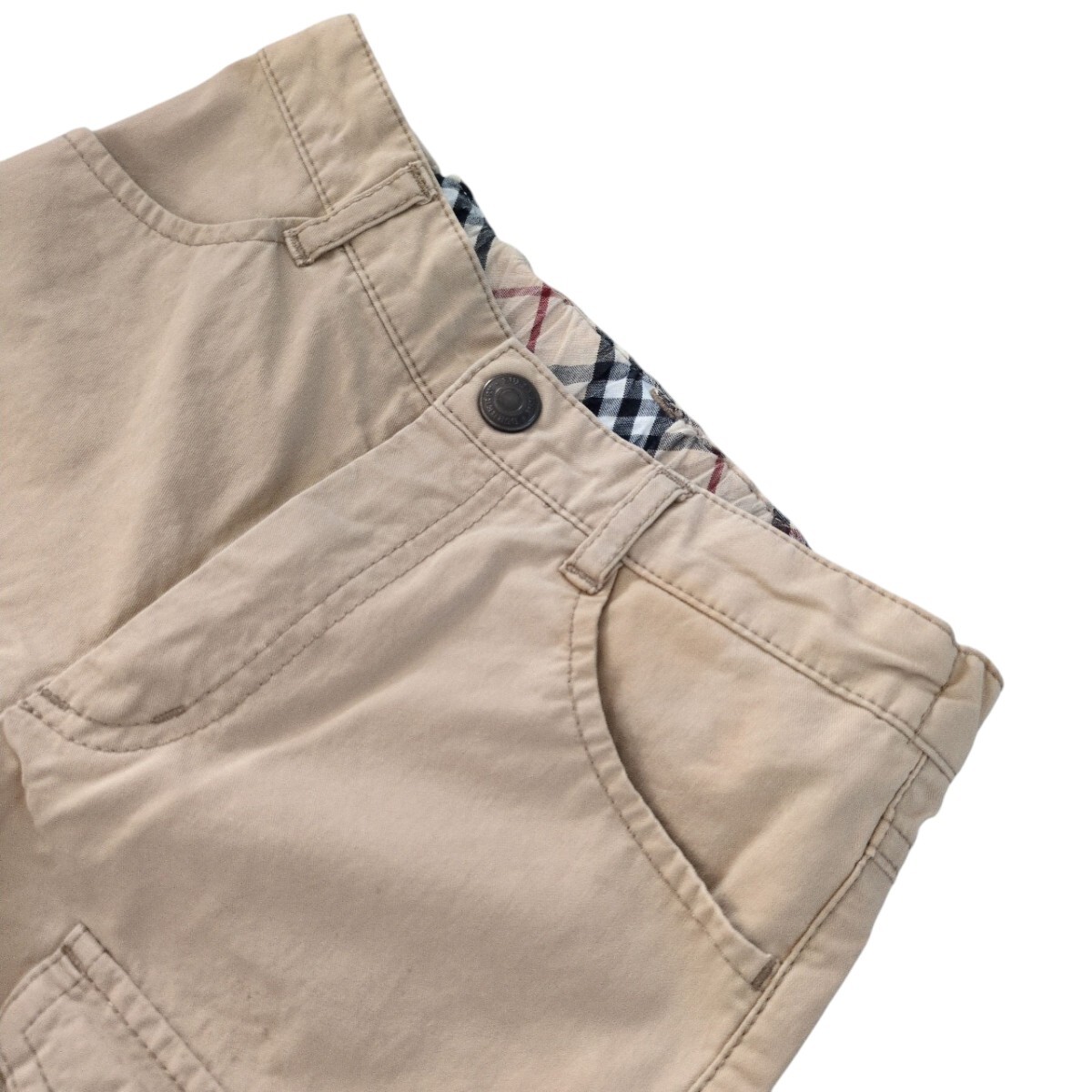 ベージュのカーゴパンツ、ポケット付きで実用的。