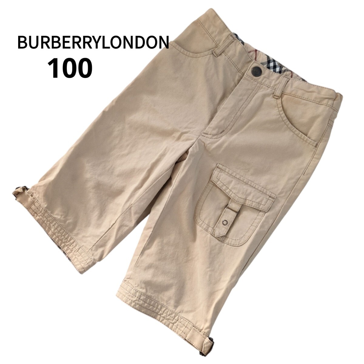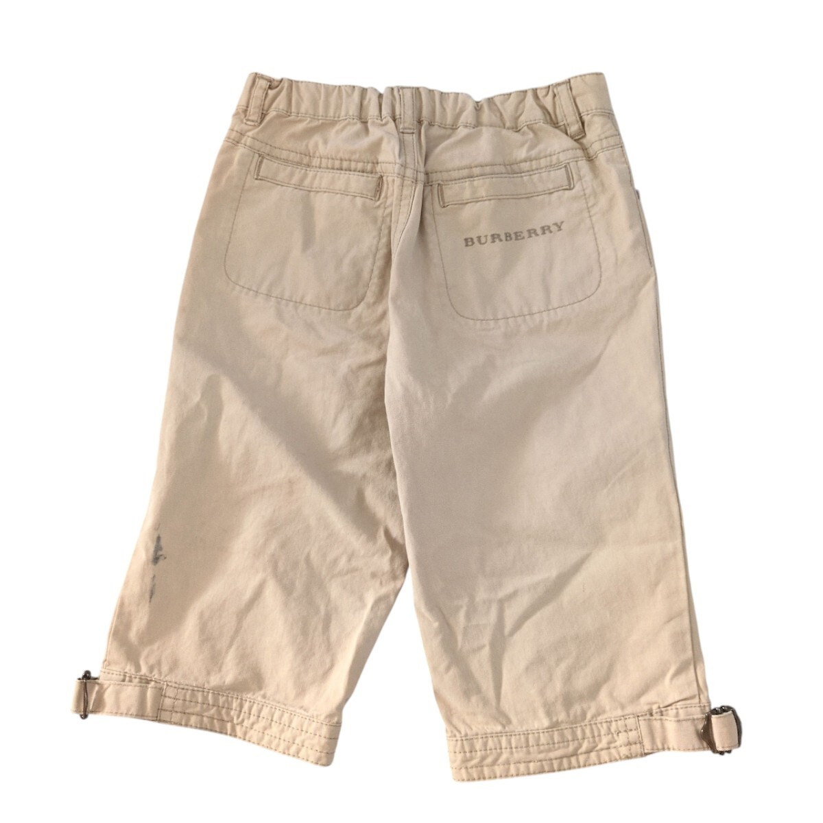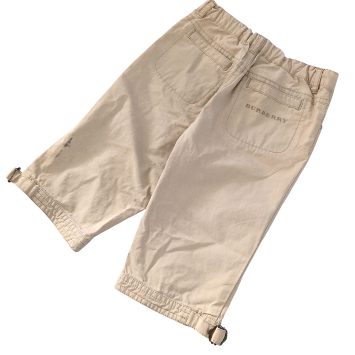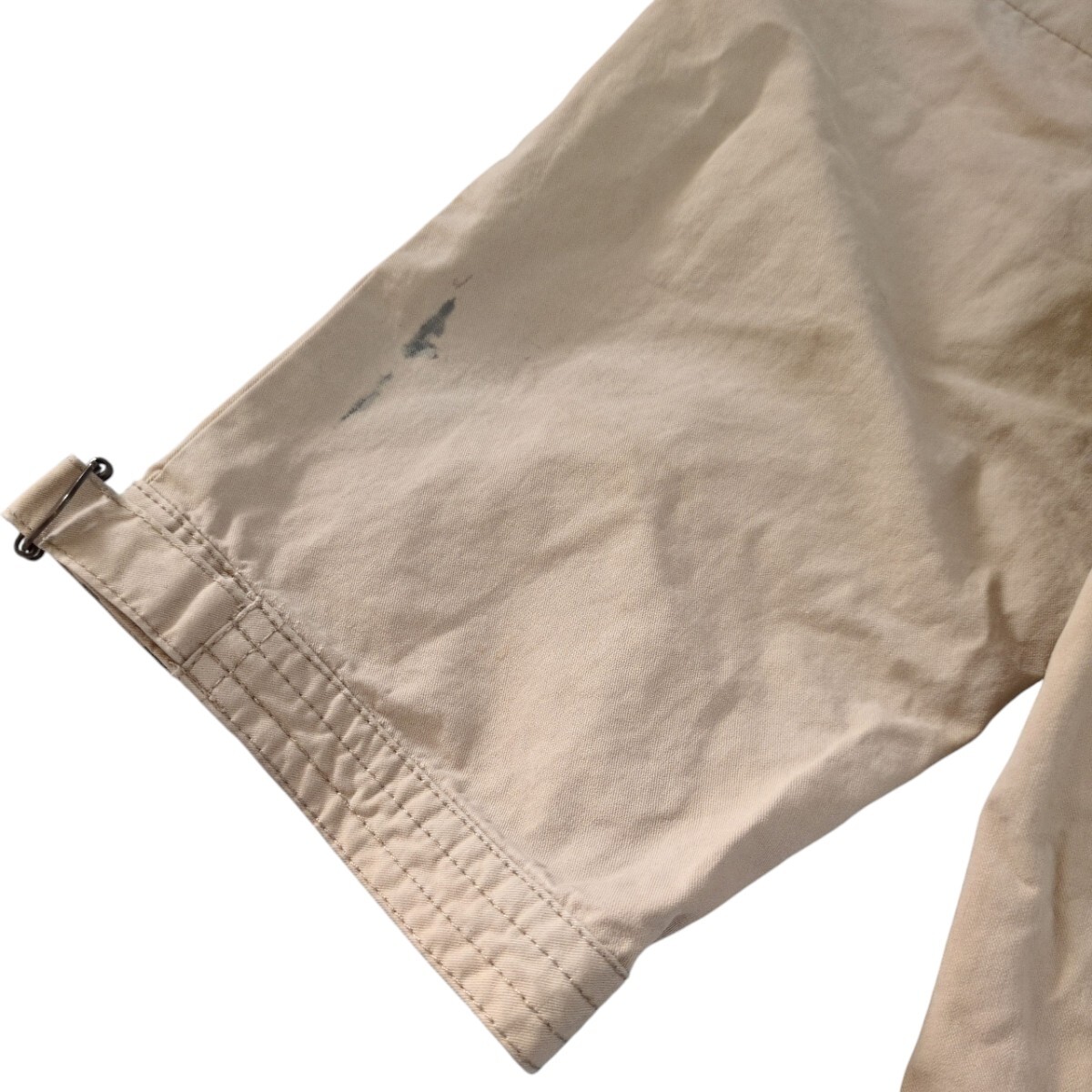 ベージュのカーゴパンツ、ポケット付きで実用的。