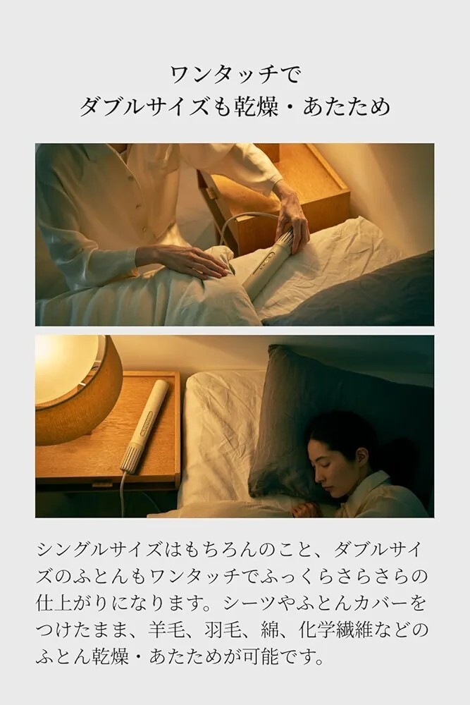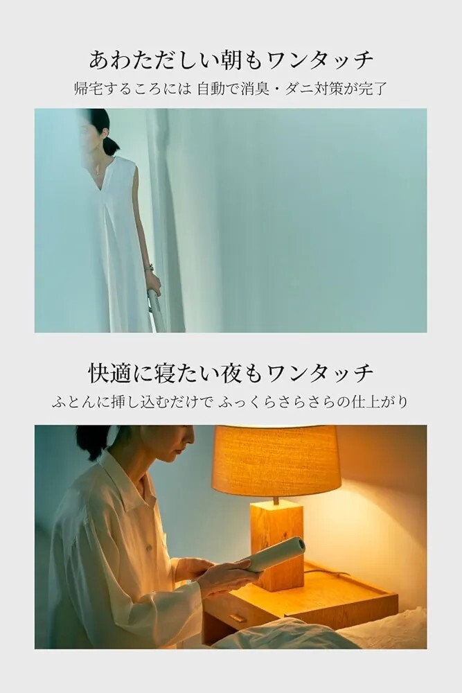 【3つのコースと静音モードを搭載】 「あたため」「送風(消臭)」「乾燥・ダニ対策」の計3つのコース、さらに「静音モード」を搭載。ワンタッチで挿し込むだけで、ランドリーに行く手間や消臭剤を吹きかける手間から解放されます。快眠のための習慣・環境づくりを365日サポートします。