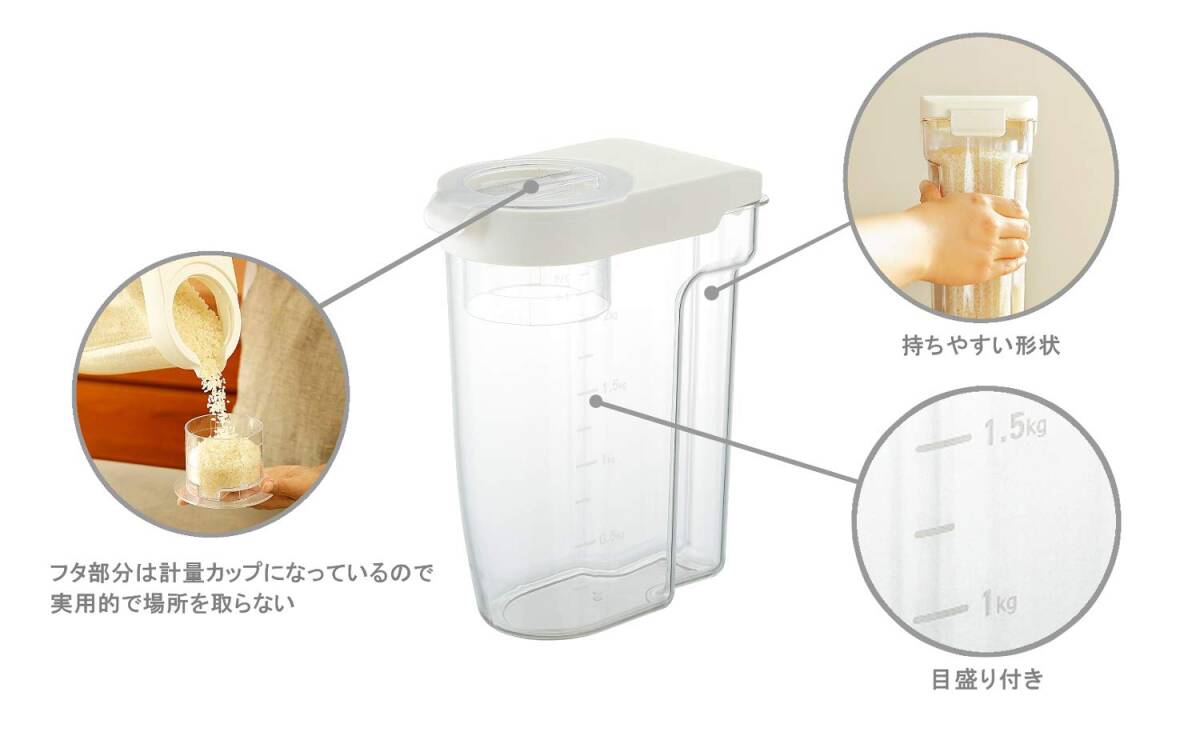 説明 冷蔵庫に保存することで鮮度を保てる米びつ 容量/約2.5L 冷蔵庫のドアポケットに入る大きさ 野菜室にも入って便利 持ちやすく、注ぎやすい形状 目盛り付き計量カップ付き