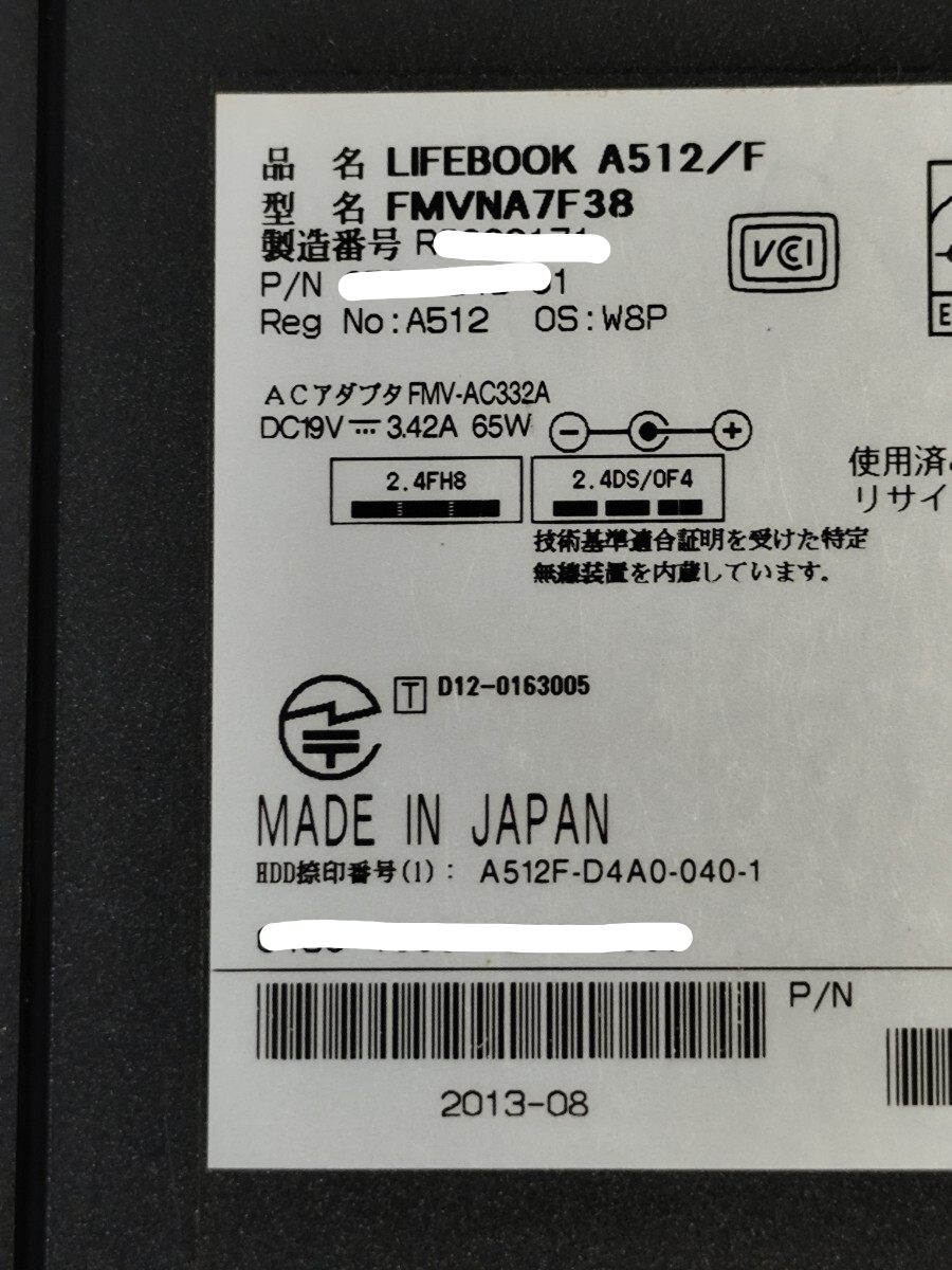 y1231 FUJITSU LIFEBOOK A512/F FMVNA7F38 C-B820 4GB 2013年 ジャンク