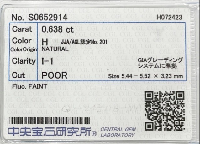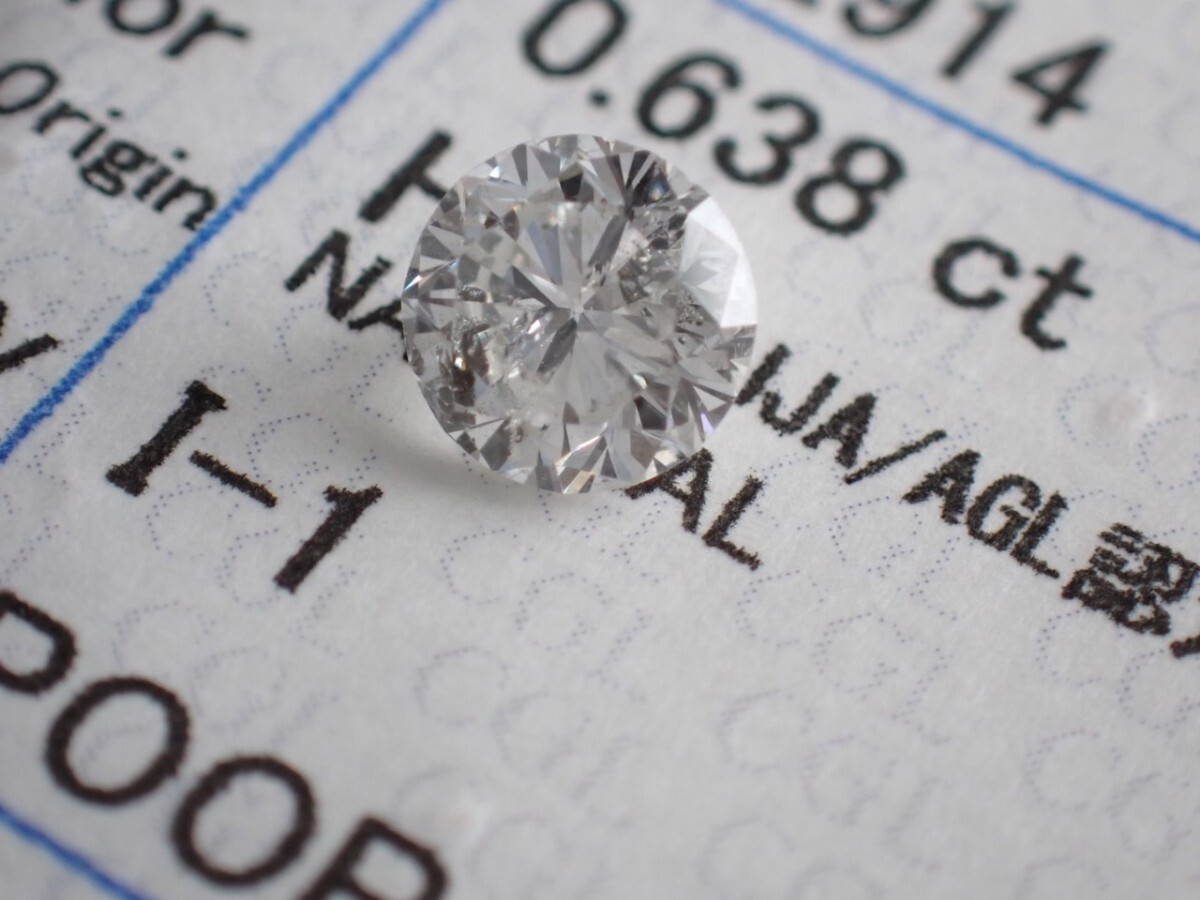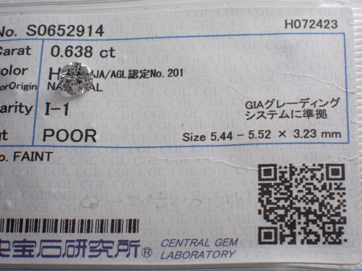 D0.638ct H I1 POOR 天然ダイヤモンドルース 裸石 NATURAL DIAMOND sorting 中央宝石研究所ソーティング付き