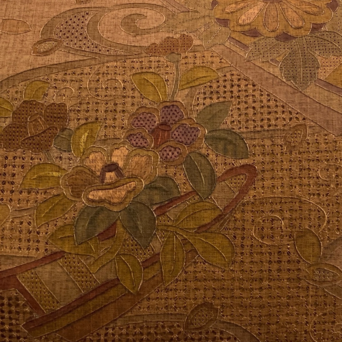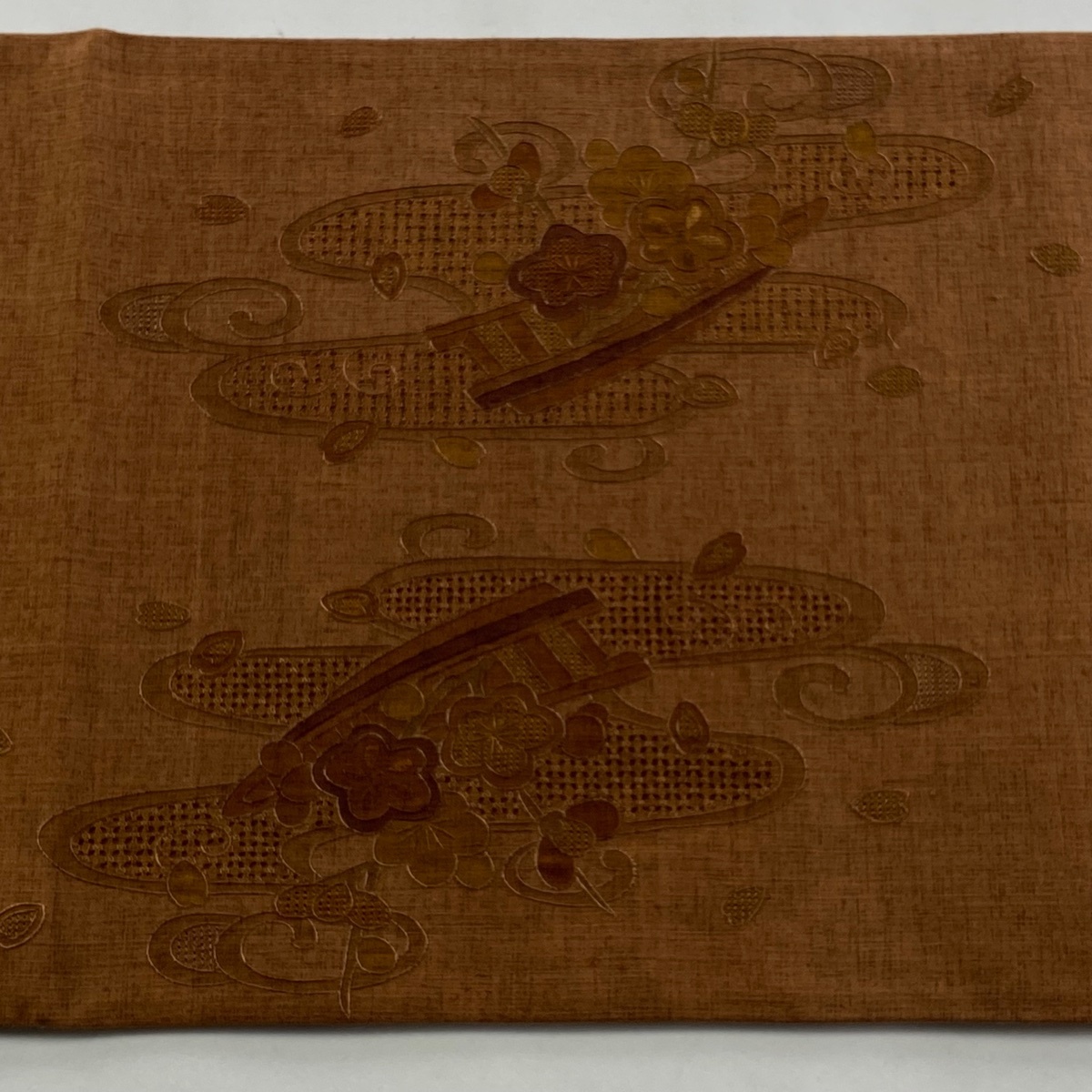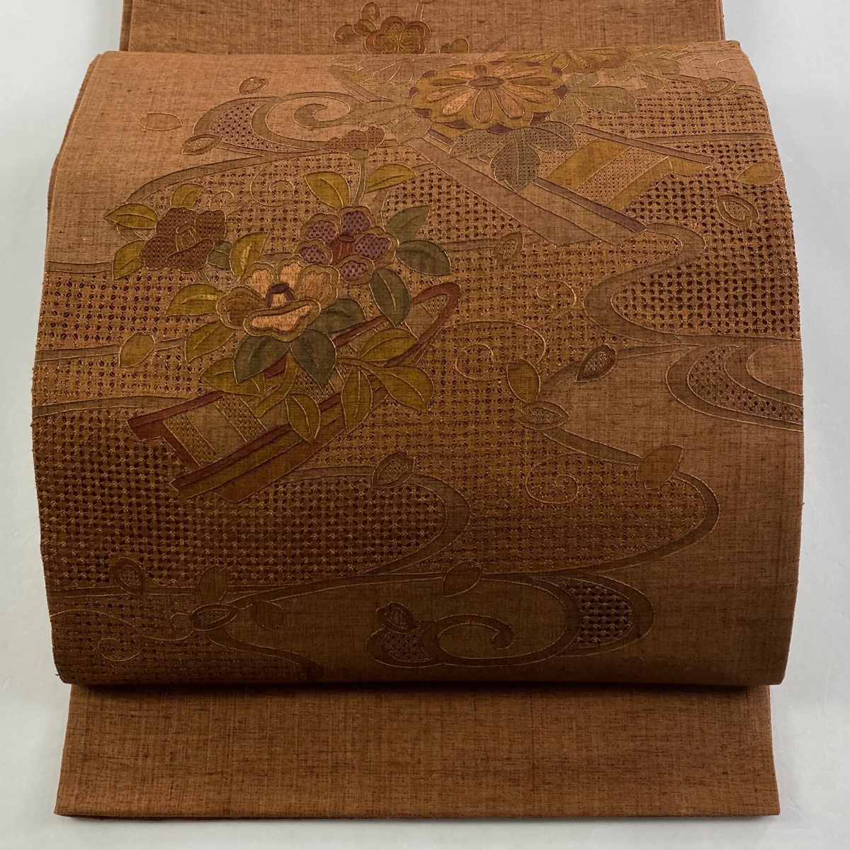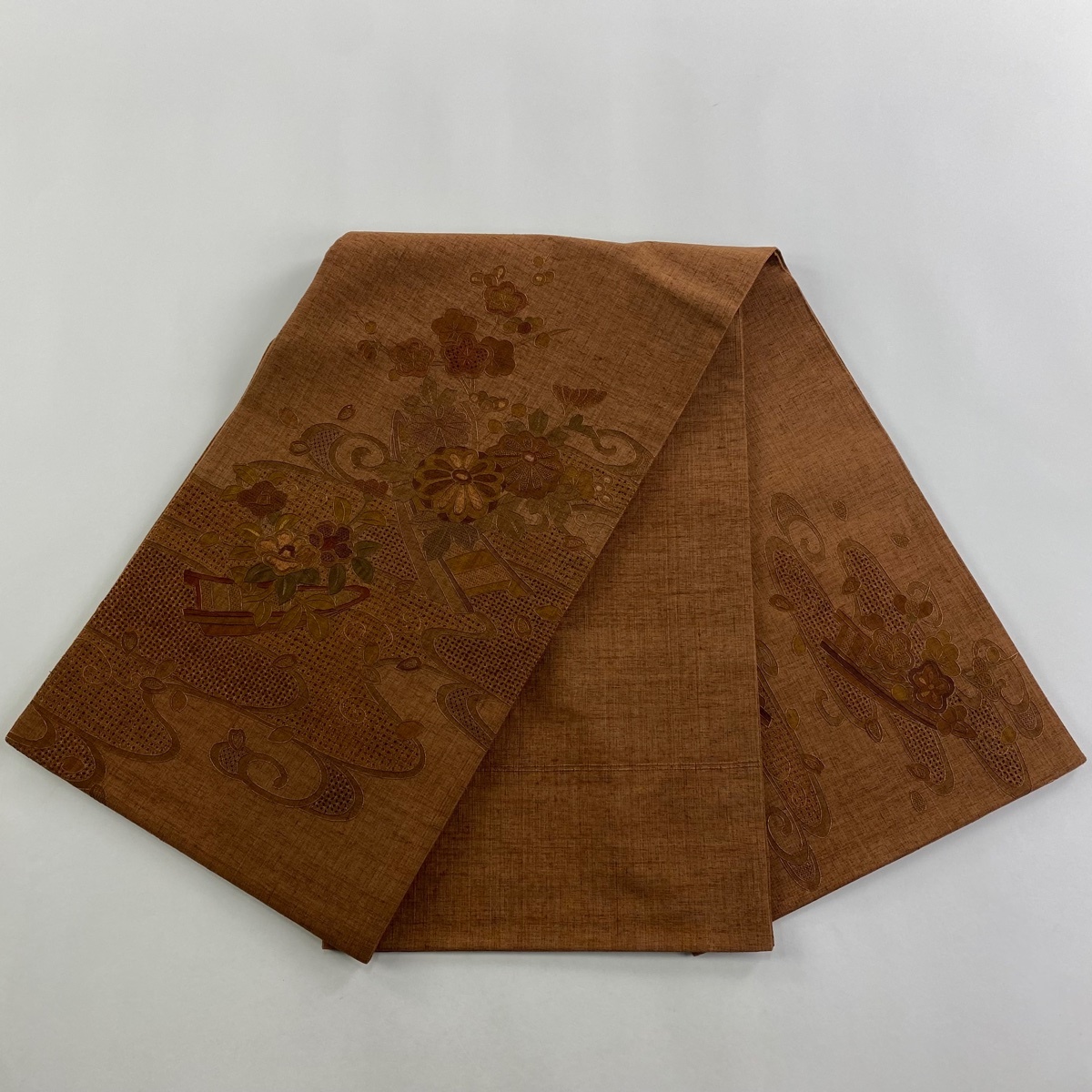 | 袋帯 美品 秀品 紬地 船 草花 刺繍 茶色 お太鼓柄 正絹 【中古】 |