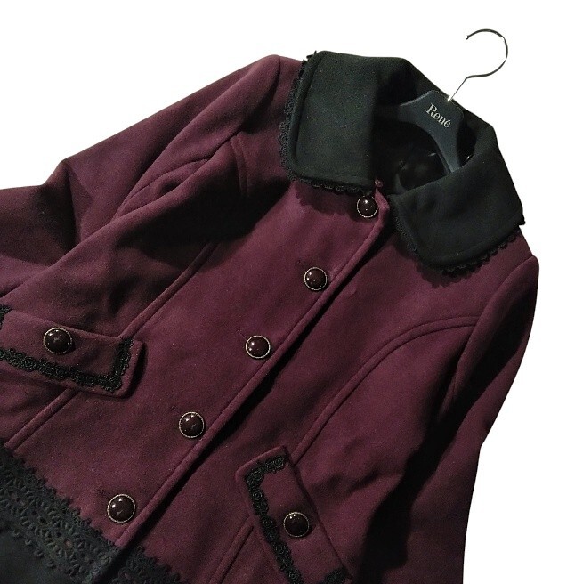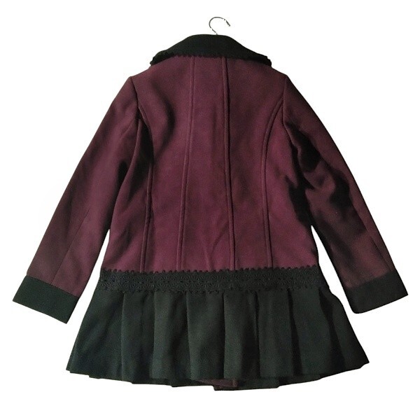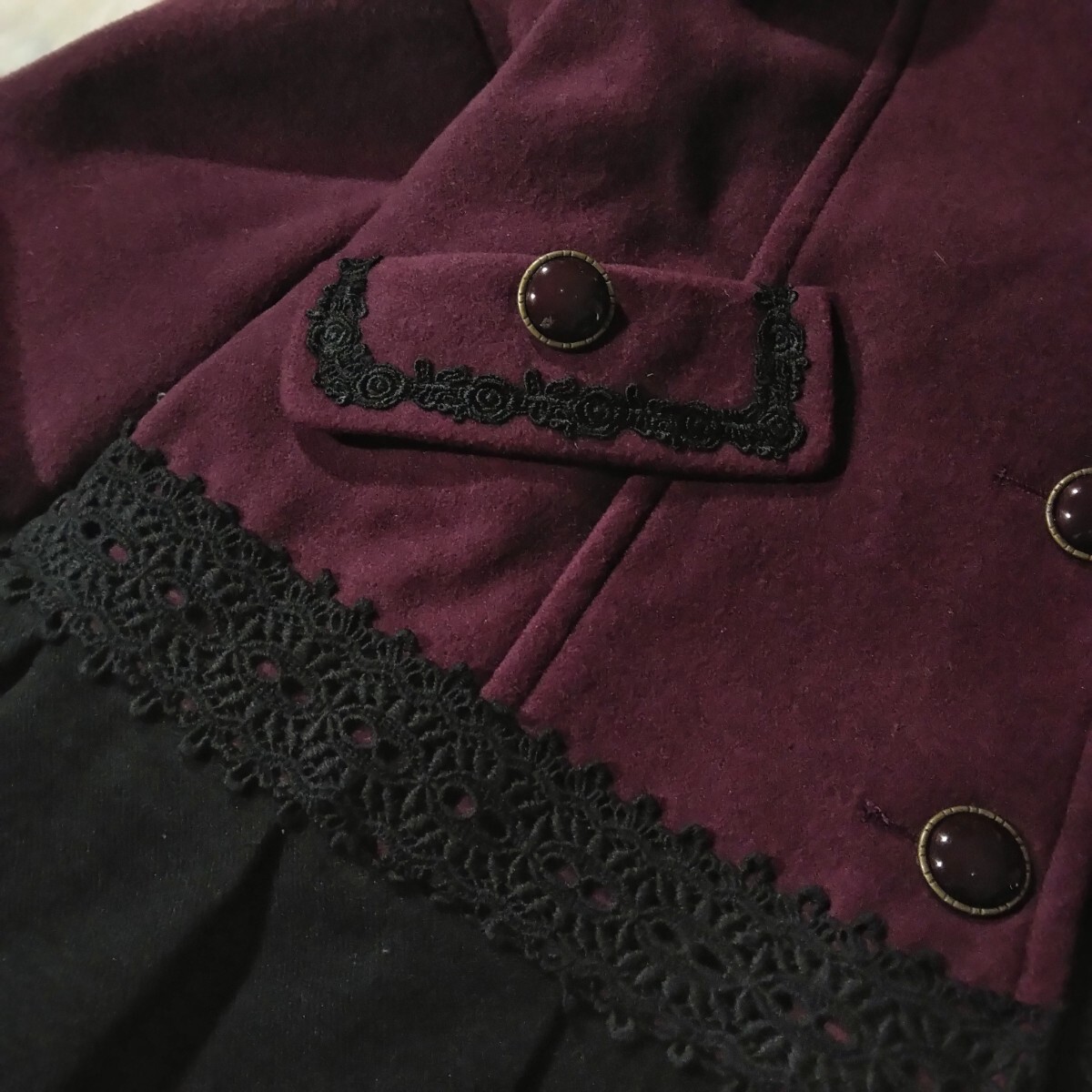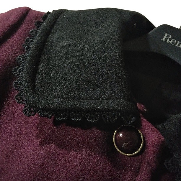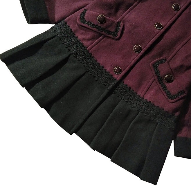 ダークめのパープルカラーとブラックのバイカラーデザインがアンティーク感あるコートになります