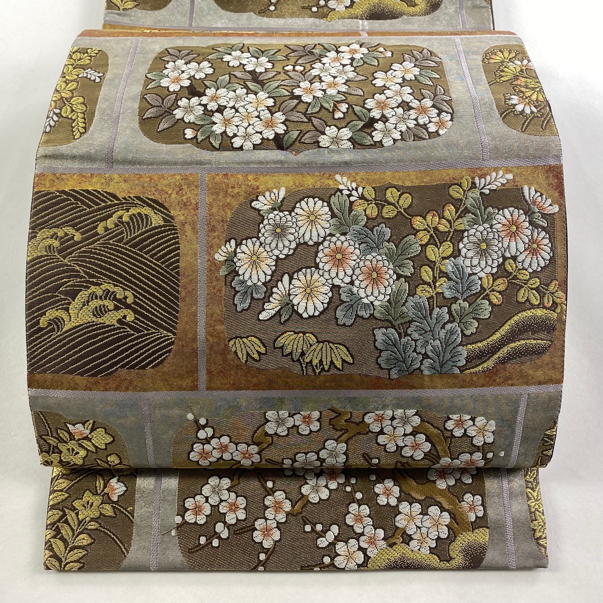 | 袋帯 美品 秀品 藤 枝花 金糸 箔 銀色 六通 正絹 【中古】 |
