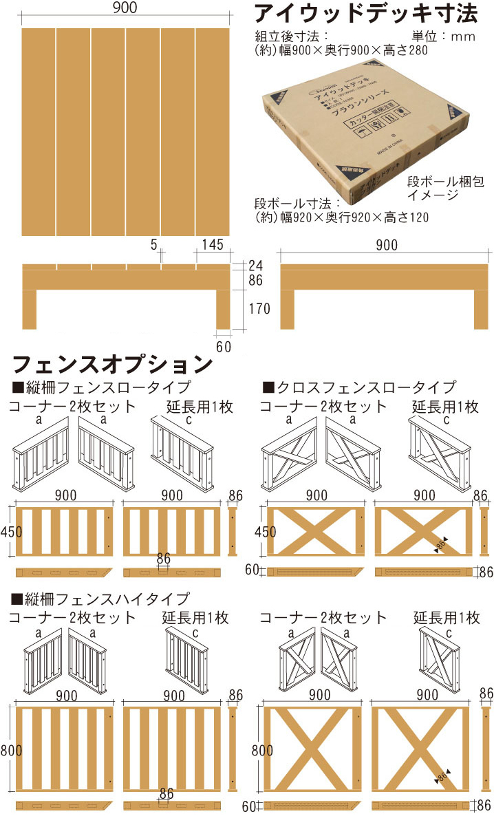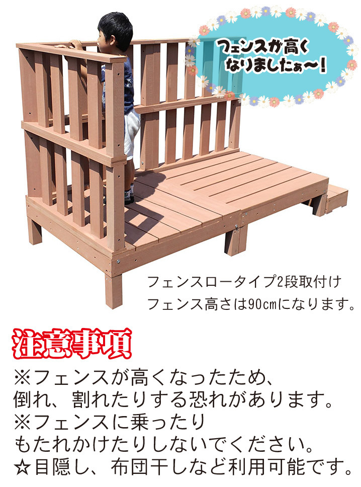 セット内容・商品寸法(単位mm):900mm×900mm×高さ280デッキ×2台、幅900mm×奥行86mm×高さ450mmフェンス×2枚