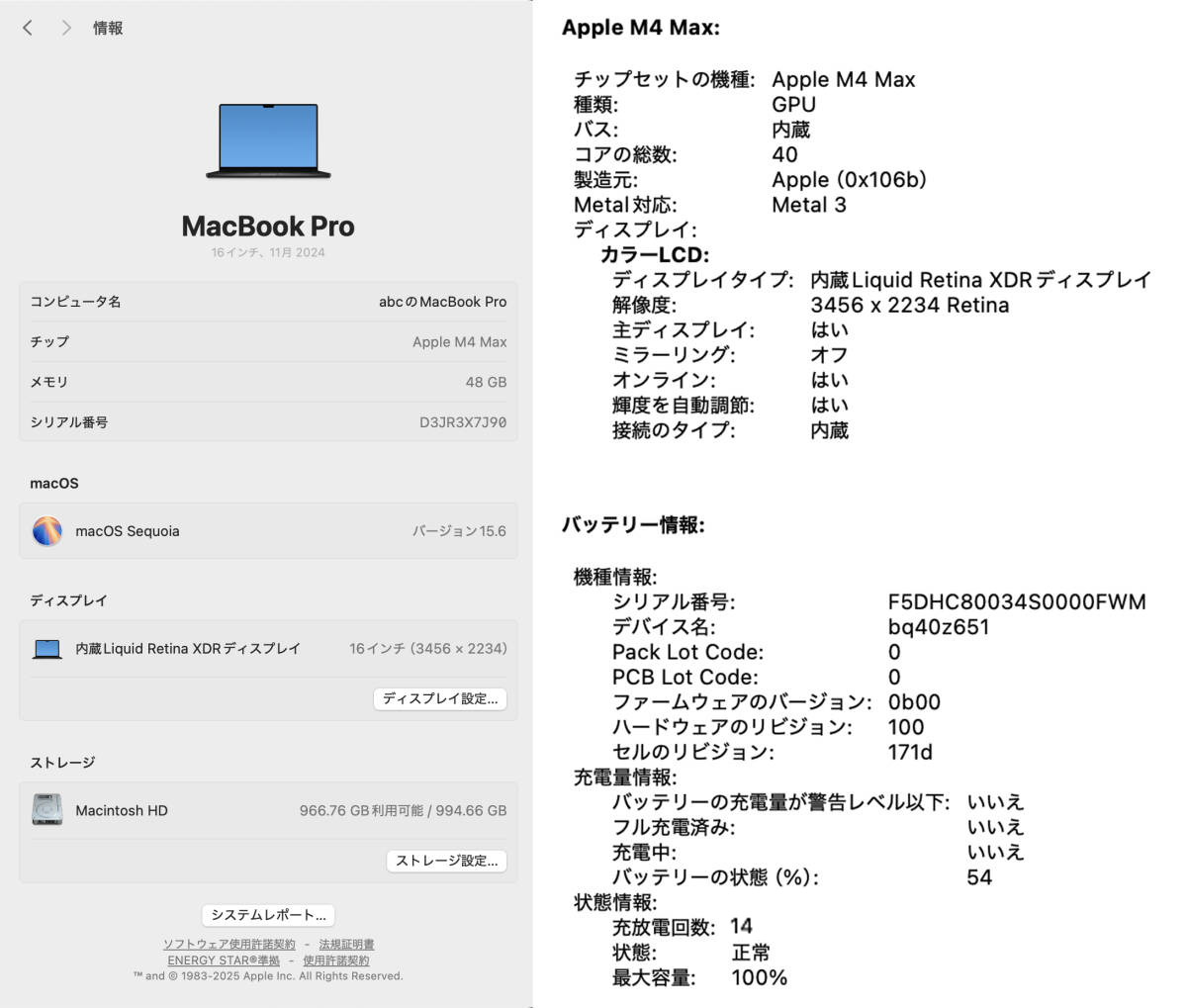 | ご覧いただき、ありがとうございます。 本商品はMacBookPro 16インチ M4 MAXモデル(スペースブラック)、 Nano-textureディスプレイ仕様です。 本体、純正アダプター、充電ケーブル、外箱、 Nano-texture用クリーニングクロとなります。 純正アダプターと充電ケーブルは未使用です。 MacBookPro本体は、現行最上位機種の M4 MAX(16コアCPU、40コアGPU)、メモリ48GBで SSDストレージ1TBモデルに、 Nano-textureディスプレイのカスタマイズ仕様です。 色はスペースブラックとなります。 新品購入すると656,800円(税込)の物となります。 主にDTP作業用にクラムシェルモードで使用していました。 持ち運び可能なメインマシンとして購入しましたが、 大きさと重さがモバイル用途に適さないのと、 DTP作業用にはオーバースペックと感じたので、 デスクトップ機へ買い替える為に出品の運びとなりました。 先日まで使用していましたが、基本動作に問題はなく、 液晶モニターもドット抜けや色褪せは見当たりません。 外付けキーボードとマウスで使用していたので 本体のキーボードやトラックパッドは、最小限の使用でした。 バッテリー充放電回数は14回、最大容量は100%です。 (メンテナンス等で充放電回数は多少増えます) Nano-textureディスプレイは、期待通りの反射低減効果があり 室内ライトの映り込みは、ほぼ消してくれます。 当初の予想を上回る絶大な効果でした。 目の疲れも軽減されるのでMacBookを購入する際は、 必須オプションだと思いました。 外観ですが使用に伴う小傷はありますが、 本体保護ケース、キーボードカバー、 トラックパッドフィルムをつけてましたので、 中古品としては綺麗な部類だと思います。 スペースブラックはスペースグレーを少し濃ゆくしたような色で 真っ黒ではありませんが、上質なカラーリングです。 初期化&アクティベーションロック解除後、 オマケとしてMac版のOfiice2024をおつけします。 仕様は以下の通りです。 ------------------------------------------------------------------------------------------- 【 チップ】16コアCPUと40コアGPU搭載 M4 Max 【本体色】スペースブラック 【キー配列】JIS配列 【 メモリ 】48GB 【 SSD 】1TB 【 ディスプレイ 】Liquid Retina XDRディスプレイ 16.2インチNano-texture仕様 【 バッテリー 】充放電:14回(正常状態) 最大容量:100% ※メンテナンスの為に充電回数が増えることがあります。 【シリアル番号】 D3JR3X7J90 《Macのアカウント情報》 [ユーザー名] abc [起動パス] 1234 ※初回起動後、お好きなアカウントへ変更してください。 ------------------------------------------------------------------------------------------- 《使用詳細》 https://support.apple.com/ja-jp/121553 全体的に綺麗だとは思いますが、 外装小傷やドット抜けや液晶色褪せ等に見落としがあるかもしれません。 本商品は中古品なので「無傷状態ではない事」を、 重々ご理解の上、入札してください。 1mm程度の小傷も許せない方や、新品同様の品質をお求めの方は、 本商品に入札せず、新品をお買い求めください。 高額商品になりますが、中古品という事をよくご理解の上、 申し訳ありませんが、ノークレームでお願いします。 ※ 注意点 ※ 一部オークションサイトで、返品時の商品すり替えが横行しています。 申し訳ありませんが、本商品は高額商品ということもあり 返品・返金・値引きなどの対応は一切お断りします。 紹介文と掲載写真をご確認の上、重々納得された上で入札してください。 | |||
