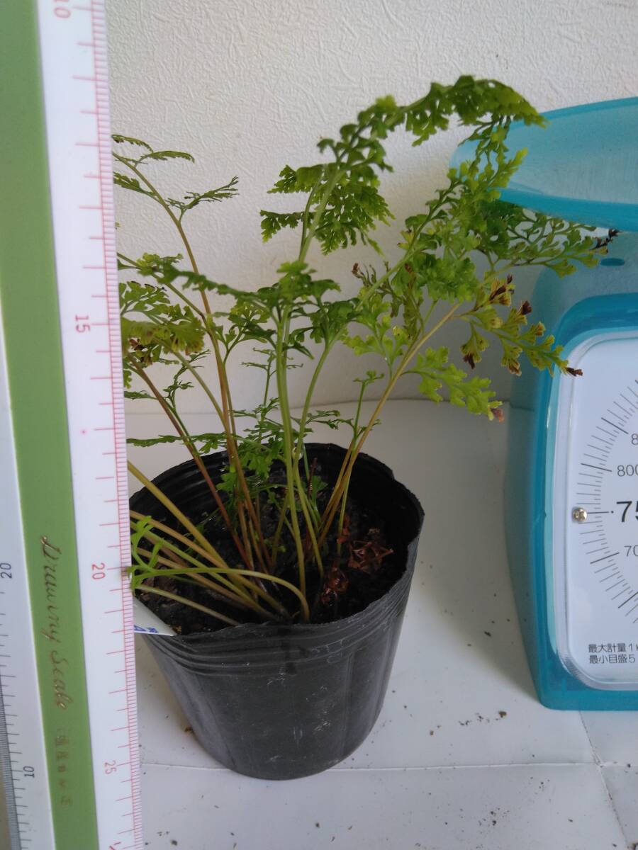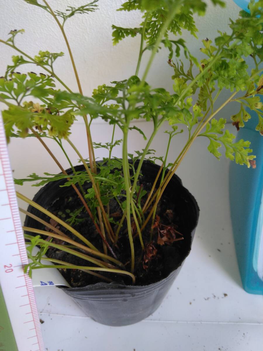 ただ、あくまで当方の自宅庭での栽培の個人的な感想や印象ですが、正直な感想として、普通のそこらへんに生えているシダや、今まで出品してきたベニシダ、アマクサシダ、トキワトラノオと比べると、丈夫なのか弱いのか、手が掛かるのか掛からないのか、よくわからない感じです。水やりを一日か二日忘れていたことがあり、ほんの少しだけしおれていたかと思うとそのまま枯死してしまったりということもありました。