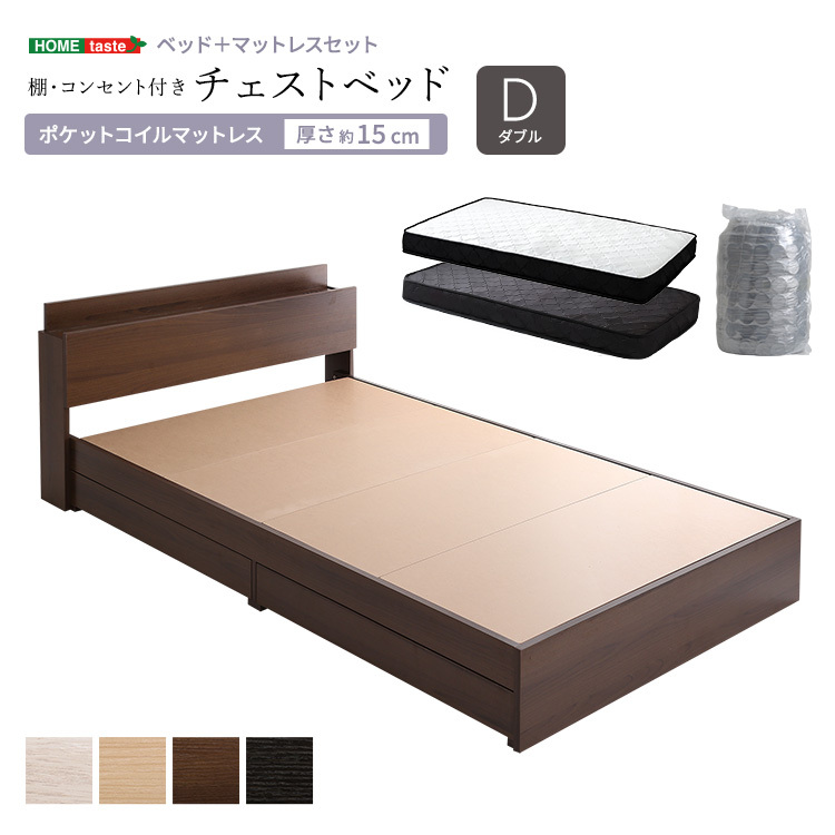 棚・コンセント付きチェストベッド ポケットコイルマットレスセット(ダブル) オーク/ホワイト