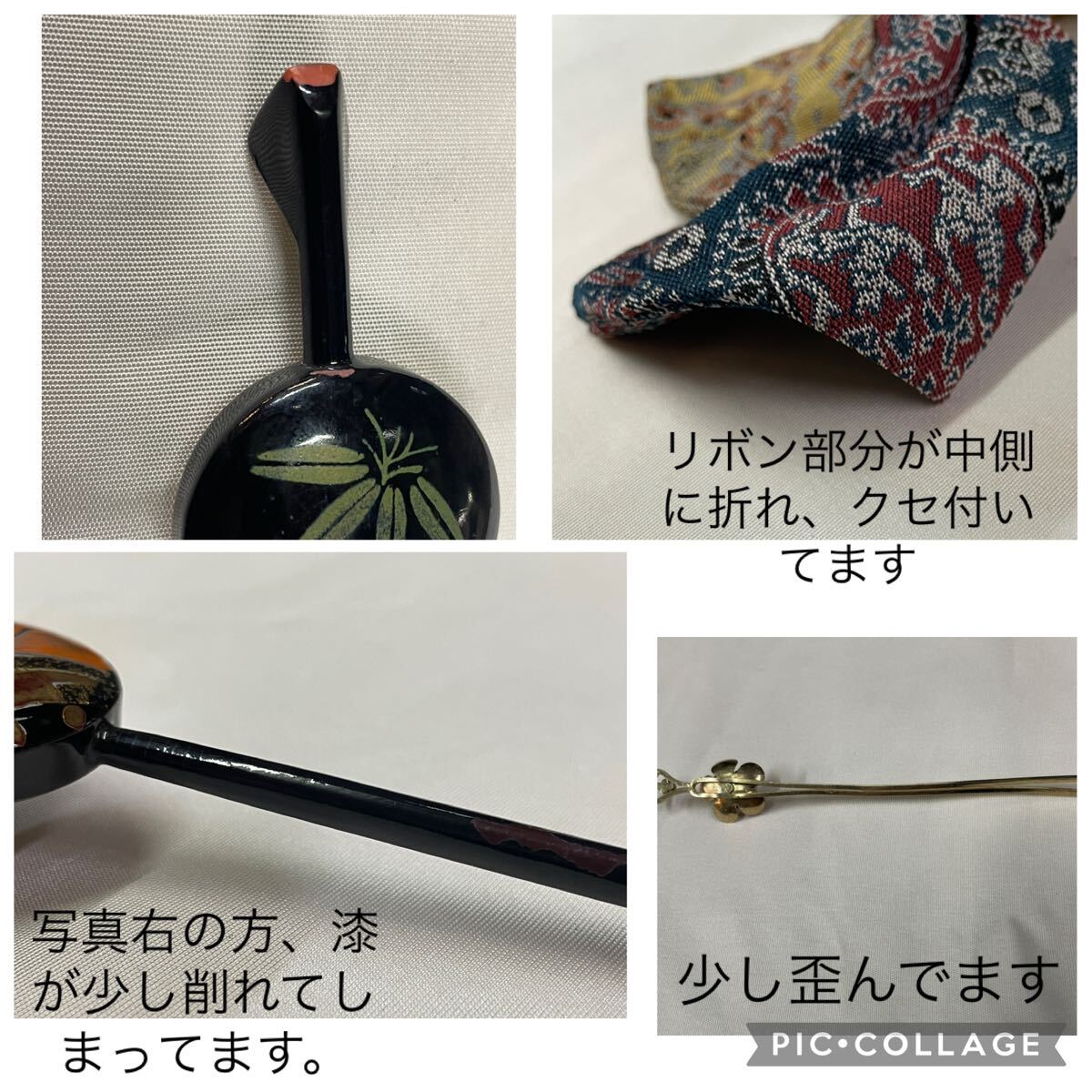 | 商品説明 | 未使用品、1、2度使用した物と混ざってます。 黒い花の柄のかんざしは傷等あります。 梅のパールが入ったかんざしは少し歪んでいます。 箱に入っていないリボンの飾りは、一部が中側に折れクセが付いてます。 ケースの蓋は割れてる箇所があります。 画像が全てですので、良くご確認お願いいたします。 |