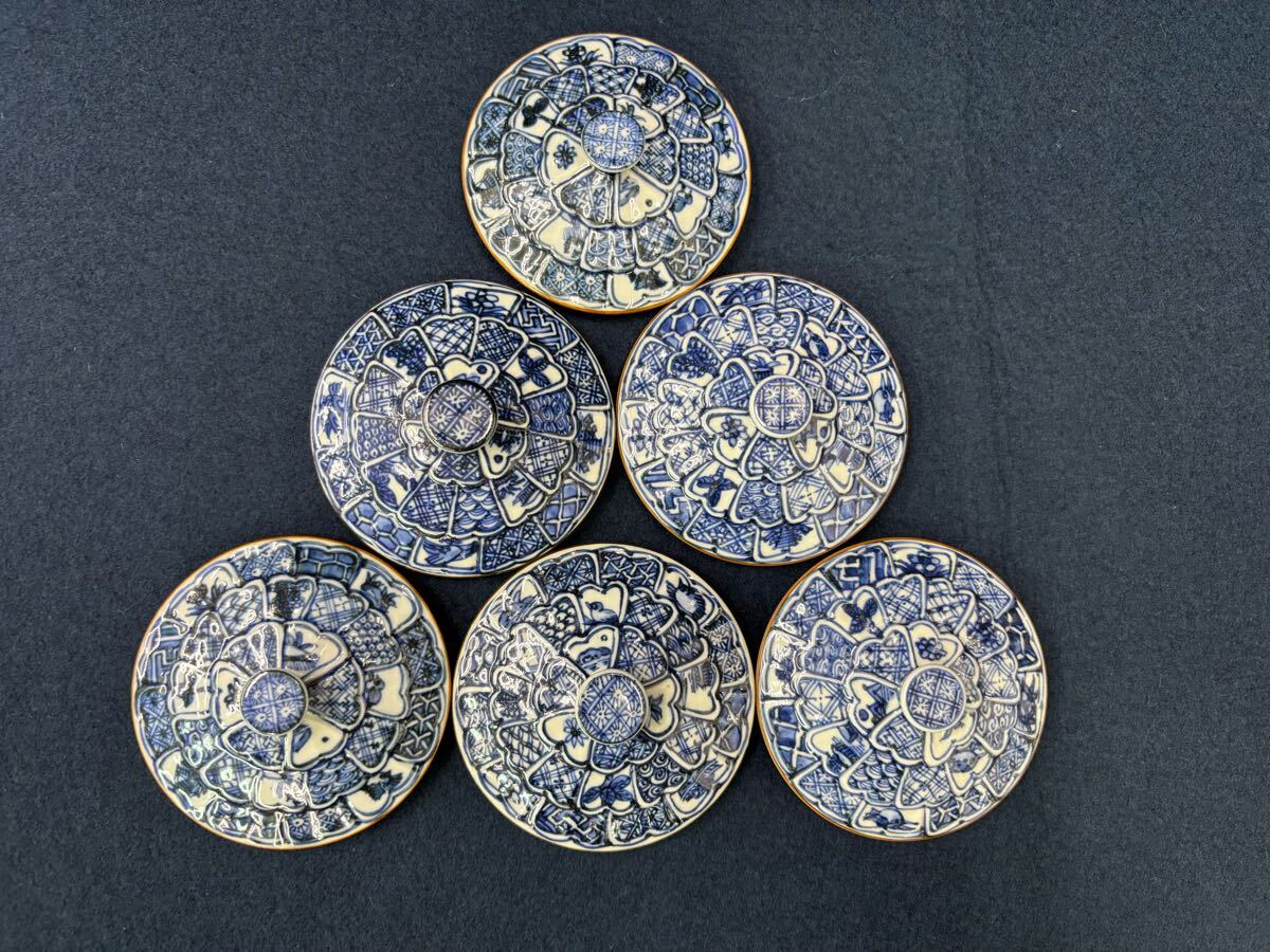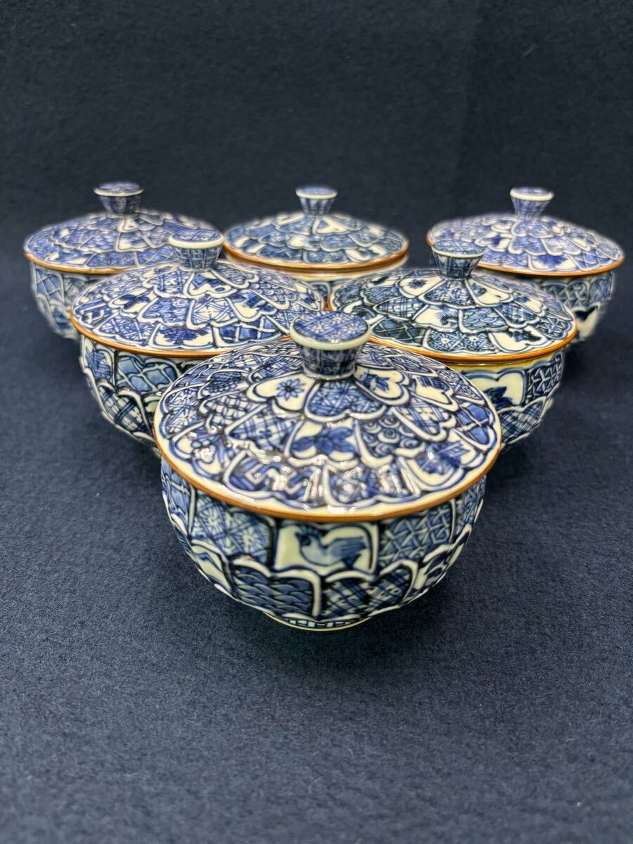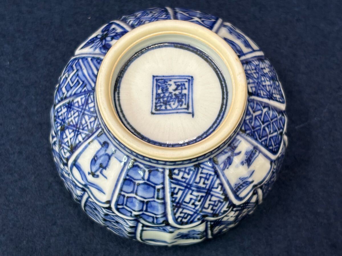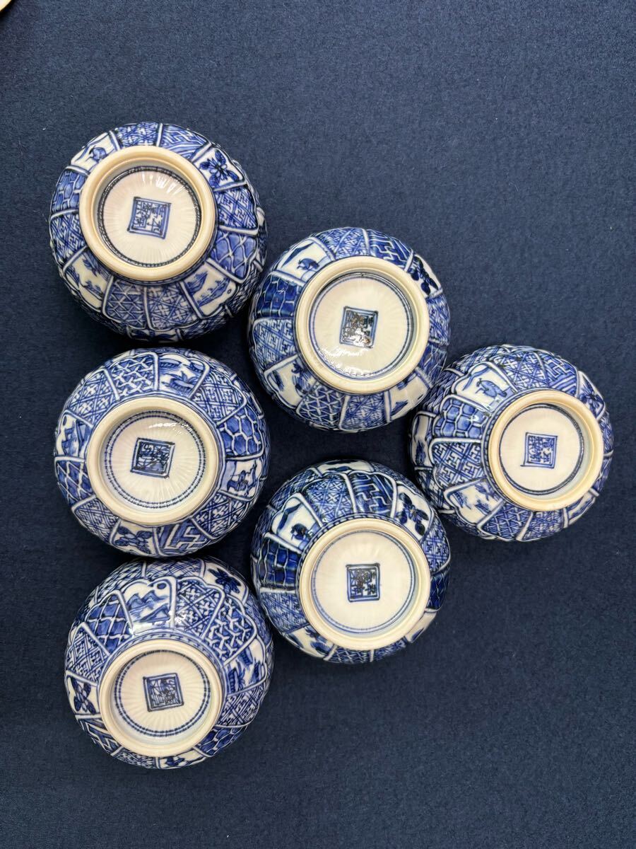 r7102516 京焼 清水焼 平安壹楽 造 染付 菊彫祥瑞 蓋付茶碗 茶道具 5客 在銘