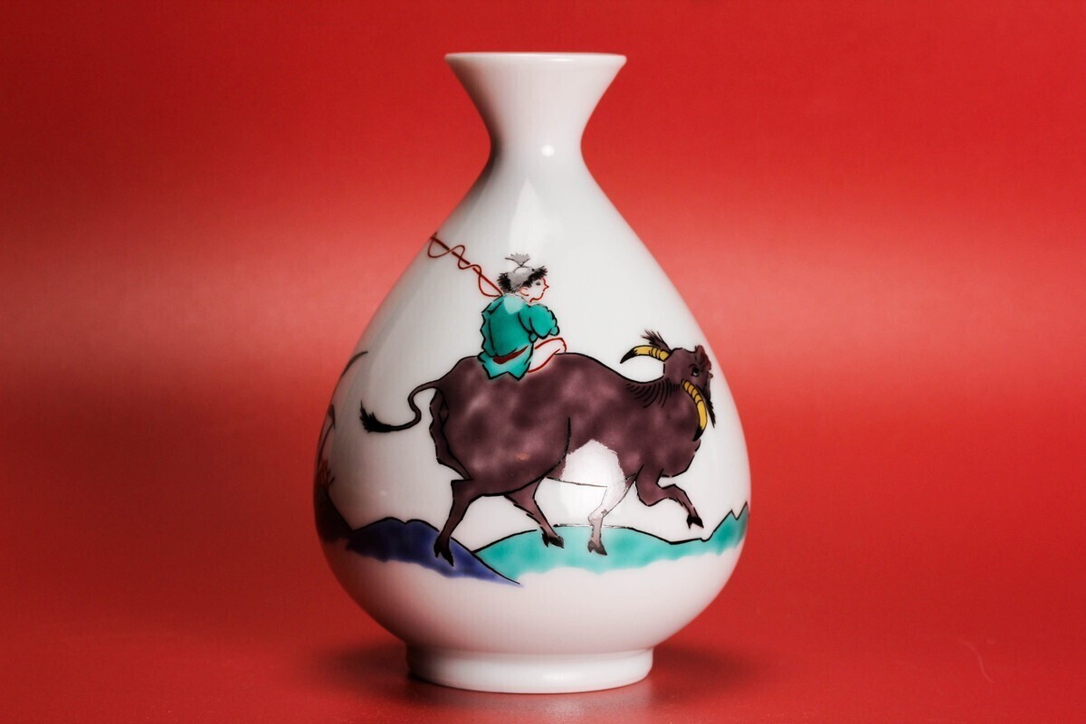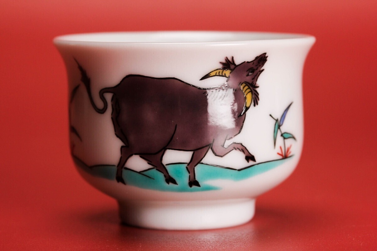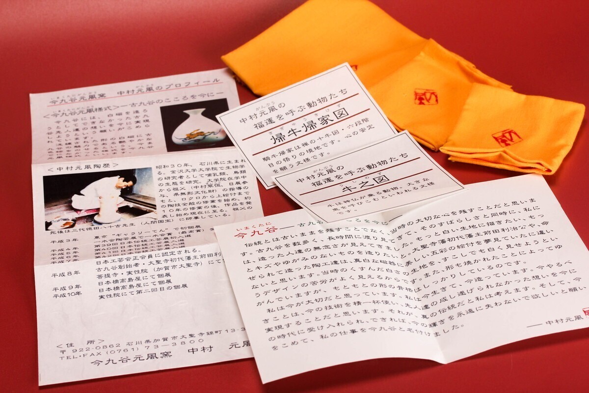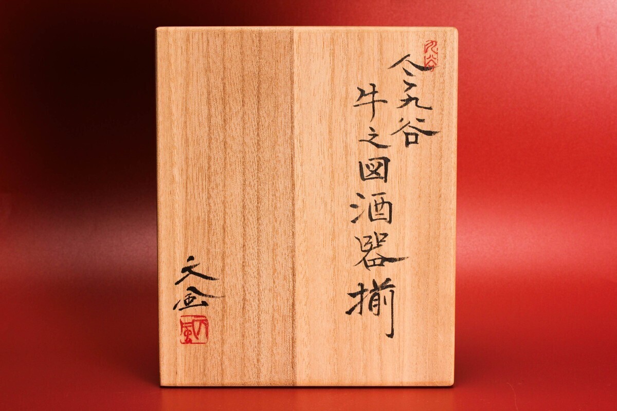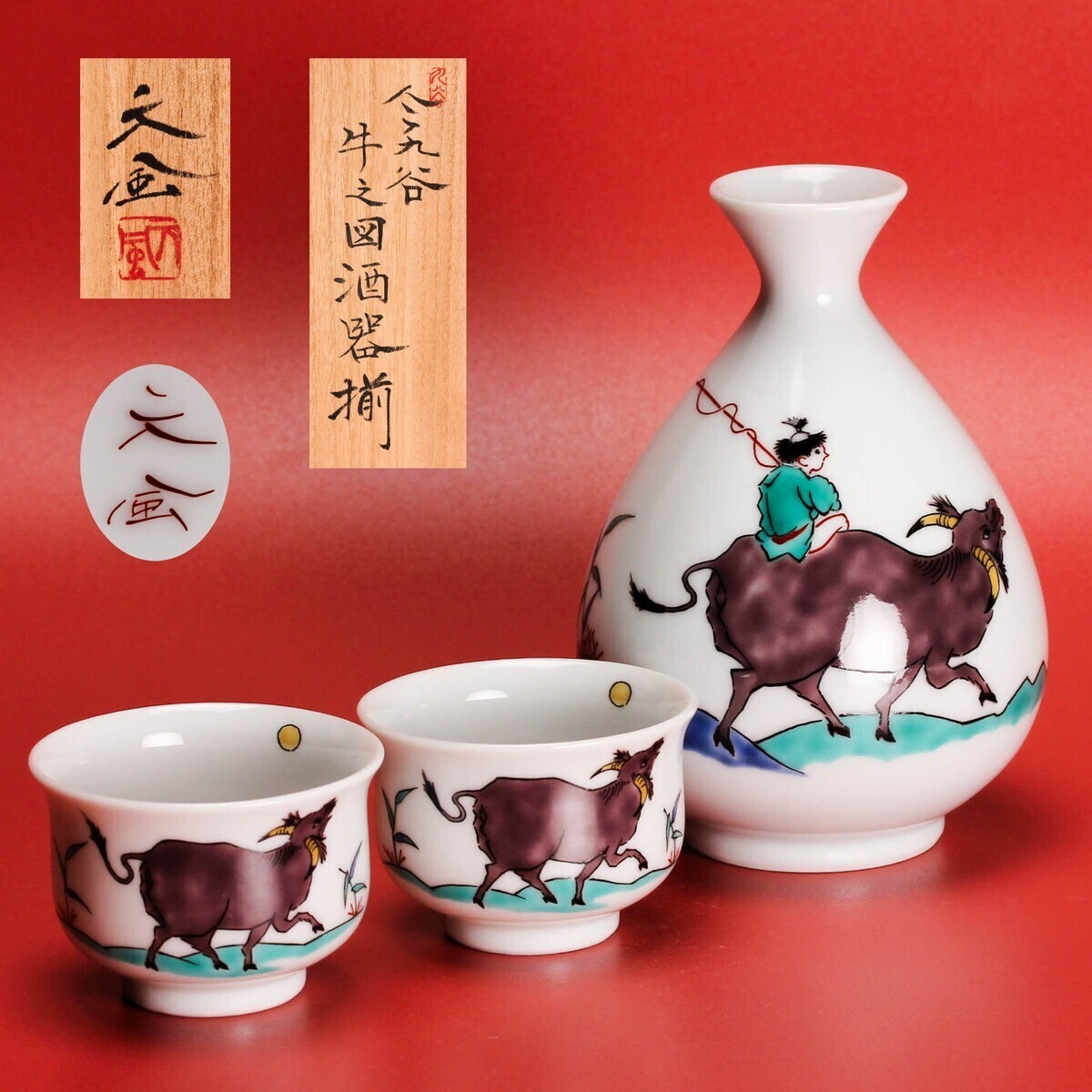 中村元風 今九谷牛之図酒器揃 徳利 ぐい呑 三客 共箱 共布 栞 本物保証