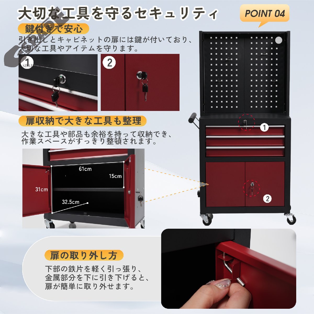 • ◎05【大切な工具を守るセキュリティ】引き出しとキャビネットの扉には鍵が付いており、大切な工具やアイテムを守ります。【扉収納で大きな工具も整理】大きな工具や部品も余裕を持って収納でき、作業スペースがすっきり整頓されます。【扉の取り外し方】下部の鉄片を軽く引っ張り、金属部分を下に引き下げると、扉が簡単に取り外せます。