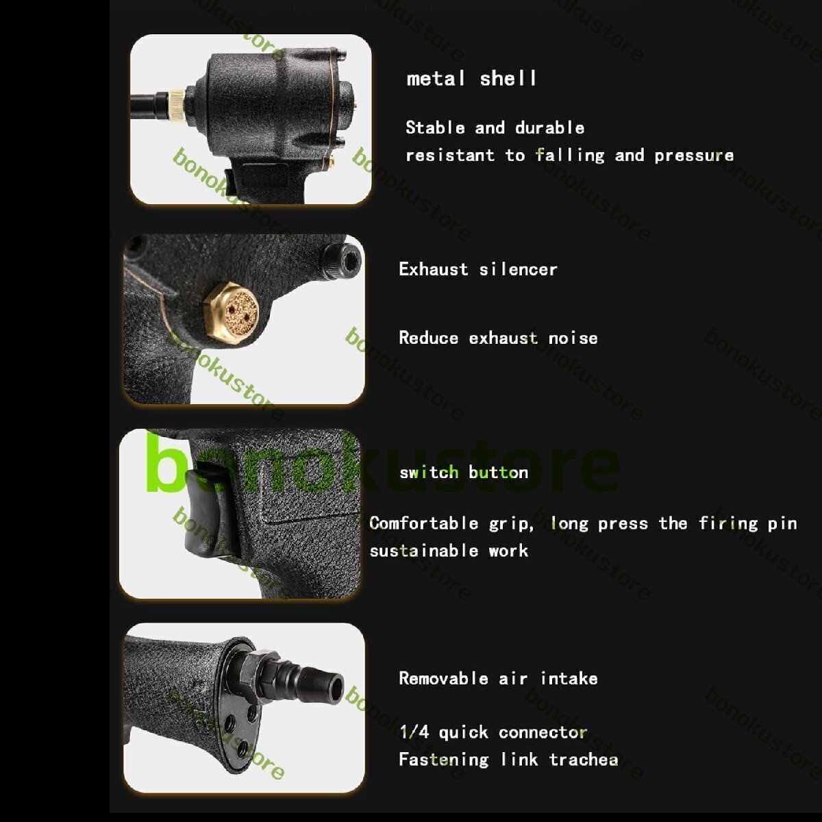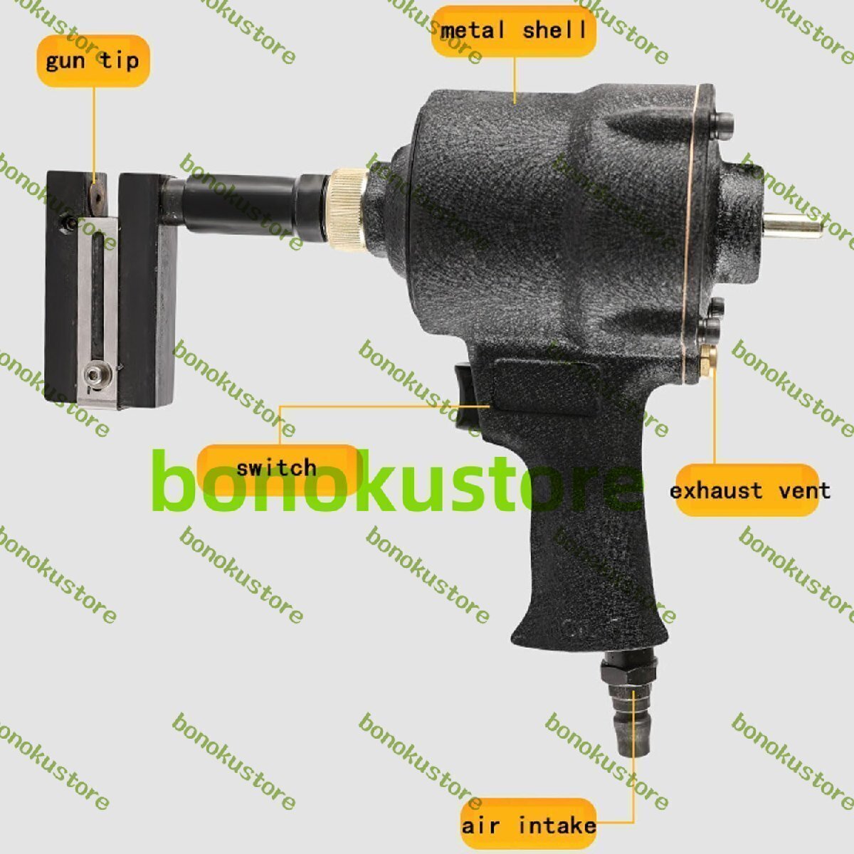 強力な勢いと素早いパンチにより、穴を開けるのが容易になります。 ワークピースの実際の状況に応じて、さまざまな深さに対応し、さまざまなマージンを調整します 360度回転調整、任意の角度に調整可能 名前: 空気圧掘削ガン 穴サイズ: 3.2/3.5/4.2/5/6/8/8.3/9/10/13mm パンチング範囲:鉄板、アルミ合金、ステンレス鋼 圧力範囲:6~8(KGF/CM*2) 重量: 1.6KG