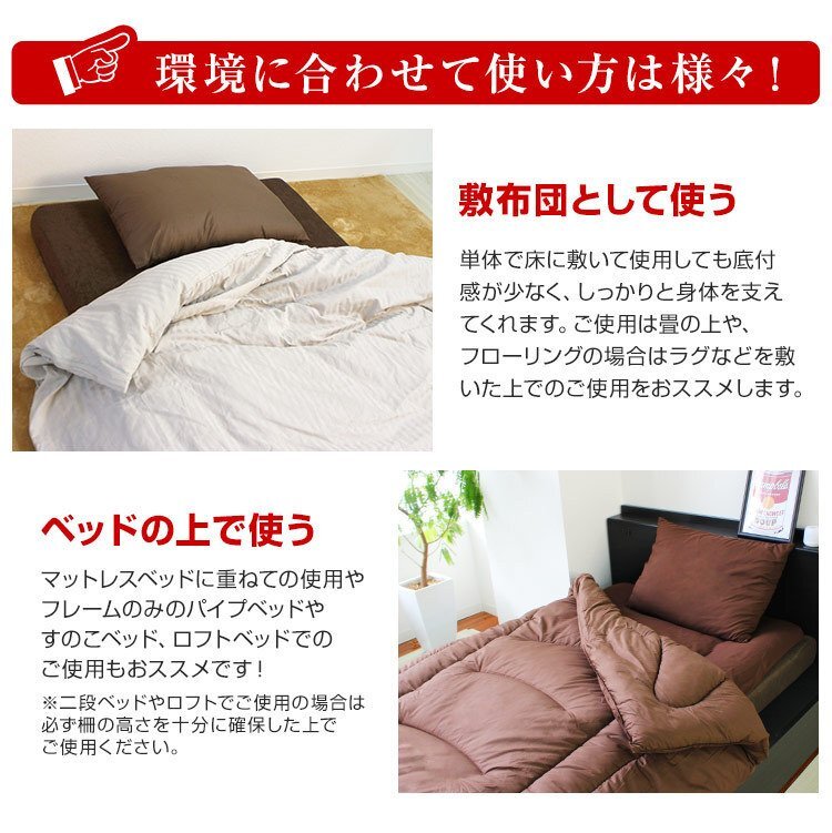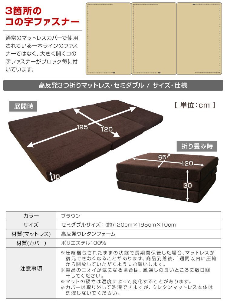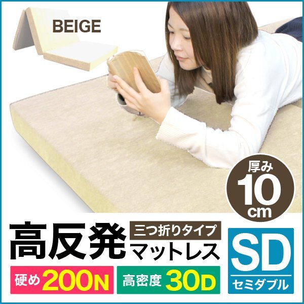 厚みたっぷり10cm! 適度な硬さで身体をしっかり支える、三つ折りタイプの高反発マットレスです。 柔らかいマットレスとは違い、身体の沈み込みを軽減した腰に優しい寝心地です。 高反発マットレスのウレタンフォームは弾性が高く、適度な硬さで身体を支えるので、底つき感もなくへたりにくいマットレスです。 寝返りが多い方や仰向けに寝ることが多い方におススメです。 簡単にたためる三つ折りタイプなので、お部屋で立て置きして日当たりのいい場所で部屋干しが可能! 取り外しやすいL字ファスナー付き洗えるカバーが付属しています! 【商品仕様】 【商品内容】 カラー:ベージュ サイズ(約):幅120cm×長さ195cm×厚み10cm(セミダブルサイズ) 折り畳み時(約):幅97cm×長さ65cm×厚み30cm 素材:高反発ウレタン 、パイル生地 他 硬さ:200ニュートン 【注意事項】 耐熱仕様ではございませんので、電気毛布との併用はおやめください。 |