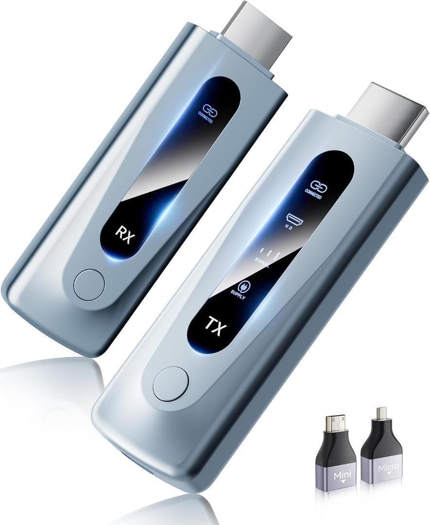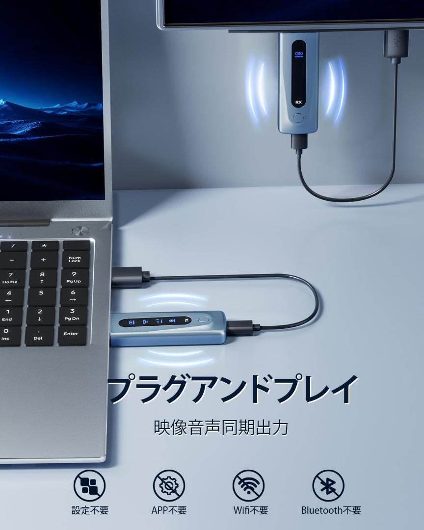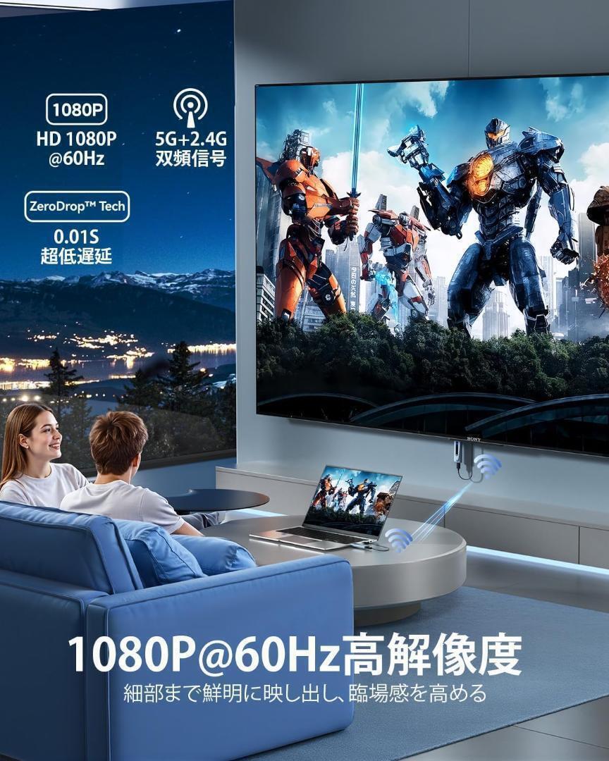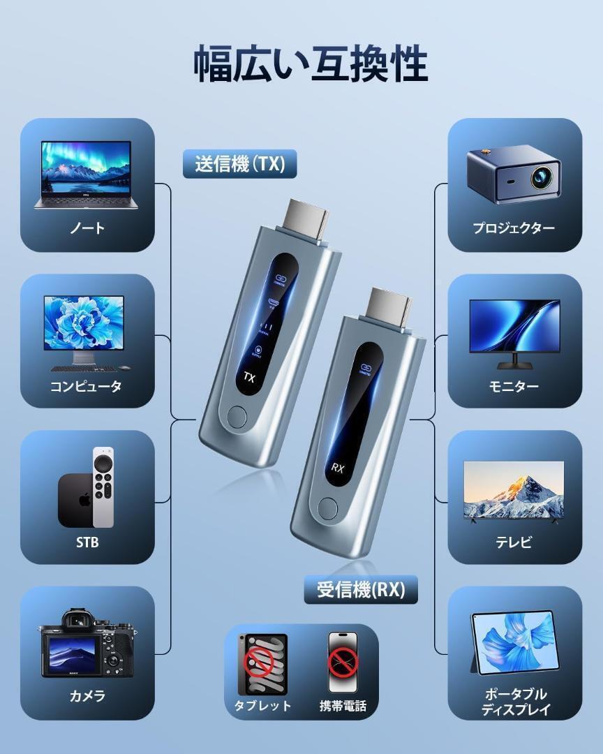 【LEDディスプレイで状態一目瞭然】ワイヤレス HDMI 送受信機セットは、完全にアップグレードされたLEDディスプレイが採用されており、接続状態、信号状態、出力状態、電源状態をリアルタイムで視覚確認できるため、操作がより直感的で分かりやすく、機器の状態を常に把握できます。全方位にアップグレードされた製品で、仕事と生活のニーズを全方位に満たし、あらゆる場面で快適な操作体験を提供します。【5G + 2.4Gデュアルバンド信号 & 1080P@60Hz解像度 & 100m長距離伝送】最大で1080P@60Hzの解像度をサポートし、60Hzのリフレッシュレートは臨場感あふれる視聴体験をもたらし、オフィスプレゼンテーションだけでなく、ゲームや映画などエンターテインメントにも適しています。5G + 2.4G無線デュアルバンド信号、電波干渉に強く、途切れることのない安定した高品質な信号伝送を実現します。最大100メートルの伝送距離と0.01秒の超低遅延(ご注意:障害物のないオープンな環境では最大100メートル。実際の伝送距離は環境によって異なる場合があります。)弊社の製品は非常に信頼性が高く、安定した性能を提供し、高解像度で鮮明なビデオとオーディオ、安定した信号、鮮やかな色彩、快適なノイズのない視聴体験を楽しめます。【プラグ&プレイで誰でも簡単設定】無線HDMIでは、複雑な設定や接続は不要で、ケーブル無しで直接使用できます。この無線接続方式により、配線を簡素化し、設置の柔軟性と便利性を高めます。受信機と送信機を組み合わせて、差し込むだけでノートPCやDVなとの画面を別のモニターに映像出力ができます。誰でも簡単に利用できます!接続方法:①5V2A 充電器で送信機 (TX) に電力を供給し、PC/ノートパソコンのHDMIポートに接続します。②5V2A 充電器で受信機 (RX)に電力を供給し、HDTV/プロジェクター/モニターのHDMIポートに接続します。③ライトが速く点滅した後、画面が表示されるまで数秒待ちます。(ご注意:送信機と受信機には必ず5 V2Aのアダプタで電力を供給してください。)【2つの表示モードで柔軟に活用&多様なデバイスに対応】HDMI無線送受信機セットはコピーモードと拡張モードの2つのモードをサポートしており、異なる使用シーンに応じて柔軟に対応できます。コピーモードでは画面の内容が完全にターゲットデバイスに複製され、同じ内容が表示されます。拡張モードでは、異なる内容をターゲットデバイスとの間で表示することができます。また、さまざまなデバイスと互換性があり、送信機(TX)はカメラ、Switch、Xbox、PS4、ノートPC、PCなどのデバイスをサポートしており、受信機(RX)はWindows、TV、Mac OS、プロジェクターなどのデバイスをサポートしています。WEB会議やリモート会議、プレゼンテーションなどのビジネス用途はもちろん、ご自宅での部屋間の映像転送など、幅広いシーンで活躍します。(ご注意:送信機はスマホ、ipadに対応できません。)【コンパクト設計&日本技適認証取得&安心のアフターサービス】小型で携帯しやすい設計を採用しており、コンパクトで軽量です。ポケットやハンドバッグなどに簡単に収納でき、旅行や出張が多い方にとっても持ち運びが容易で、余分なスペースを節約できます。どこにでも持ち運ぶことができます。日本の技術基準適合証明(技適)を取得済み(技適番号:210-208820)。電波法に準拠し、安全性・安定性ともに保証された高品質モデル。安心の正規認証で、快適なワイヤレス体験をお楽しみください
