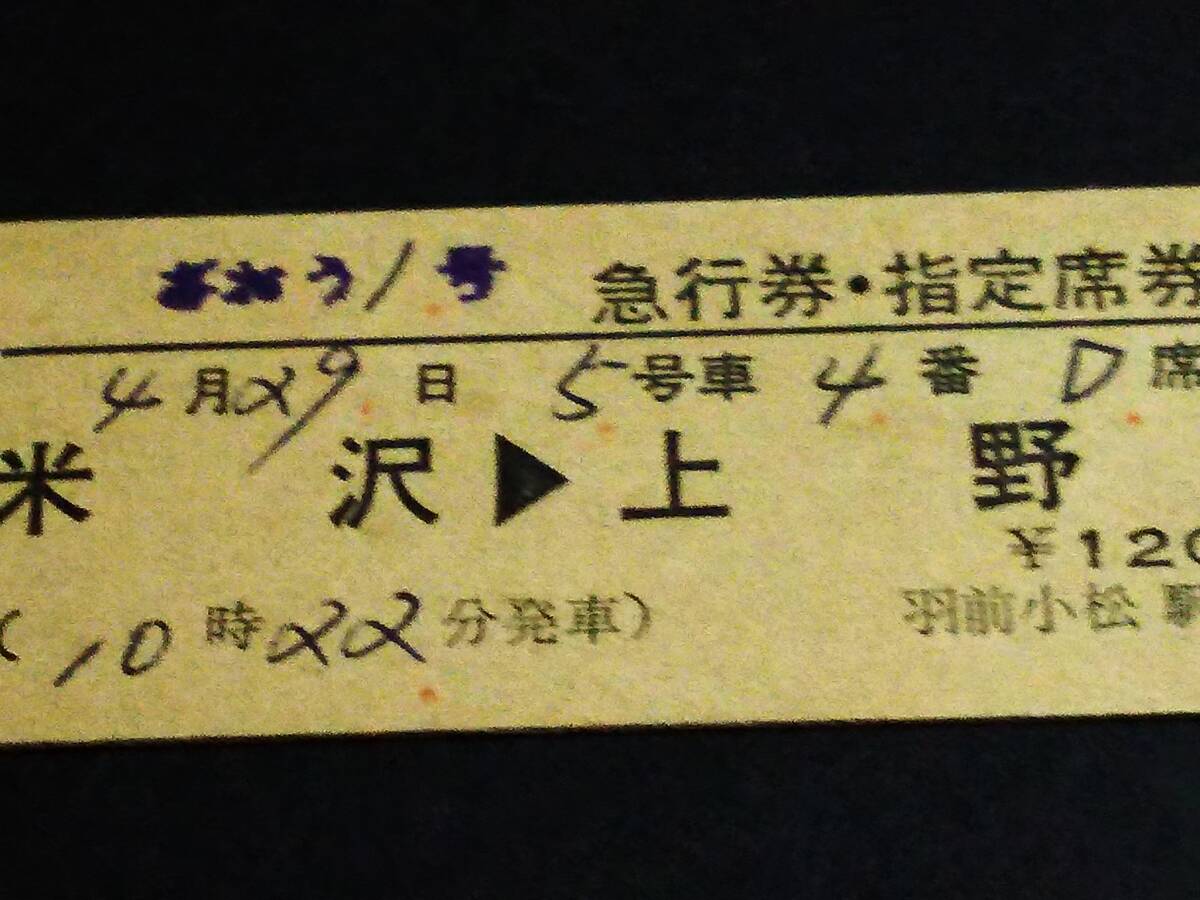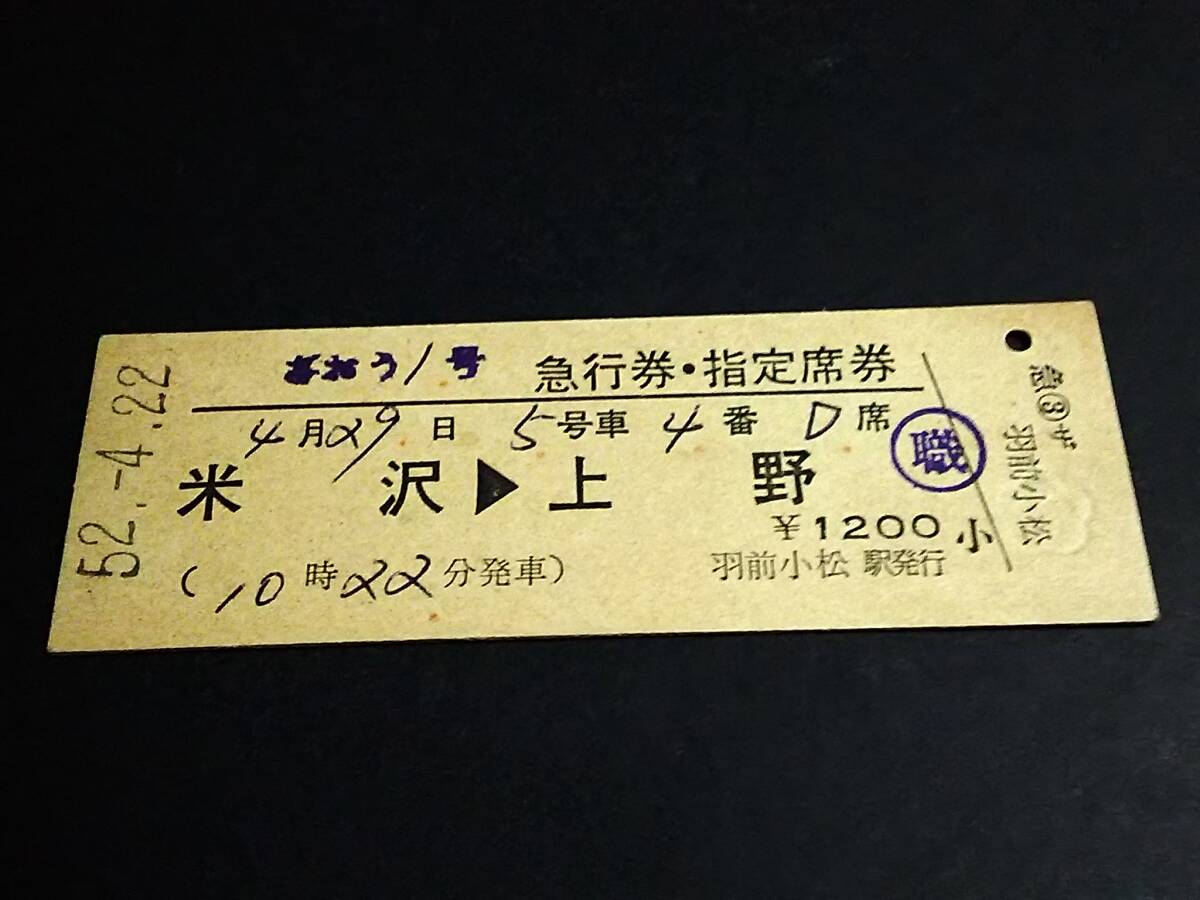 【[区間印刷]急行券・指定席券(D型)[近隣駅発行]】 「ざおう1号」米沢⇒上野 S52.4.22 羽前小松駅発行