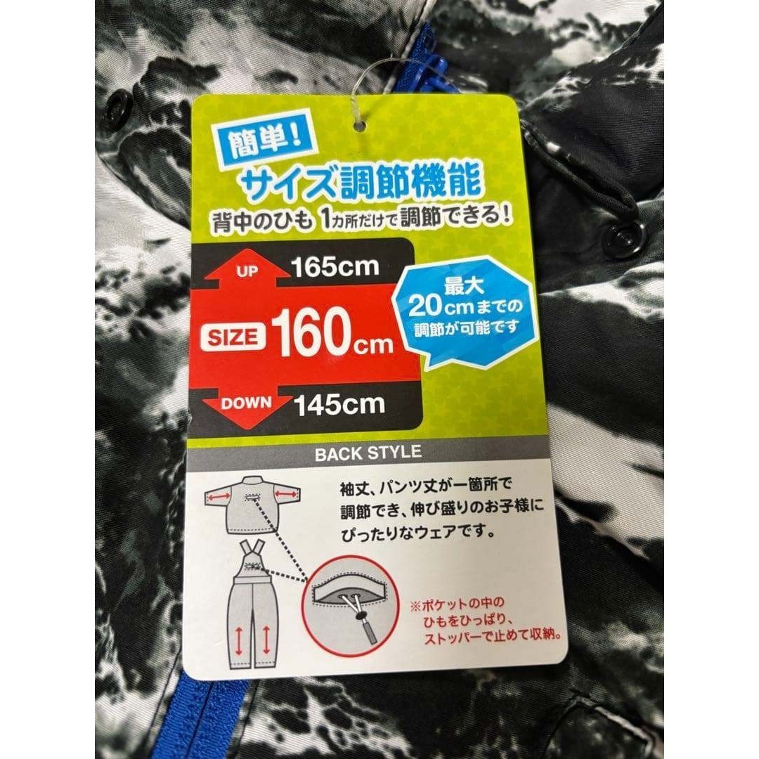 上着にもパンツにも紐で引っ張り上げるサイズ調節機能が付いてますので、小さい頃から長く来ていただけます。