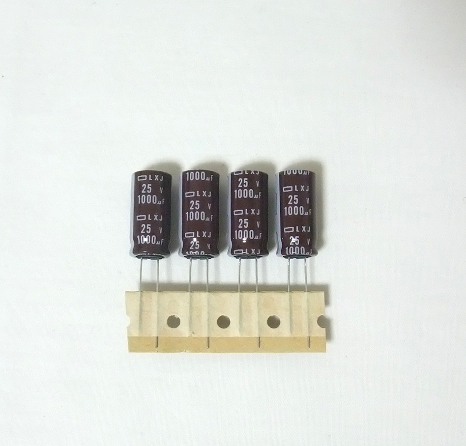 日本ケミコン製アルミ電解コンデンサ1000μF(ELXJ250ETD102MK25S、25V、4個セット、LXJシリーズ、新品)です。