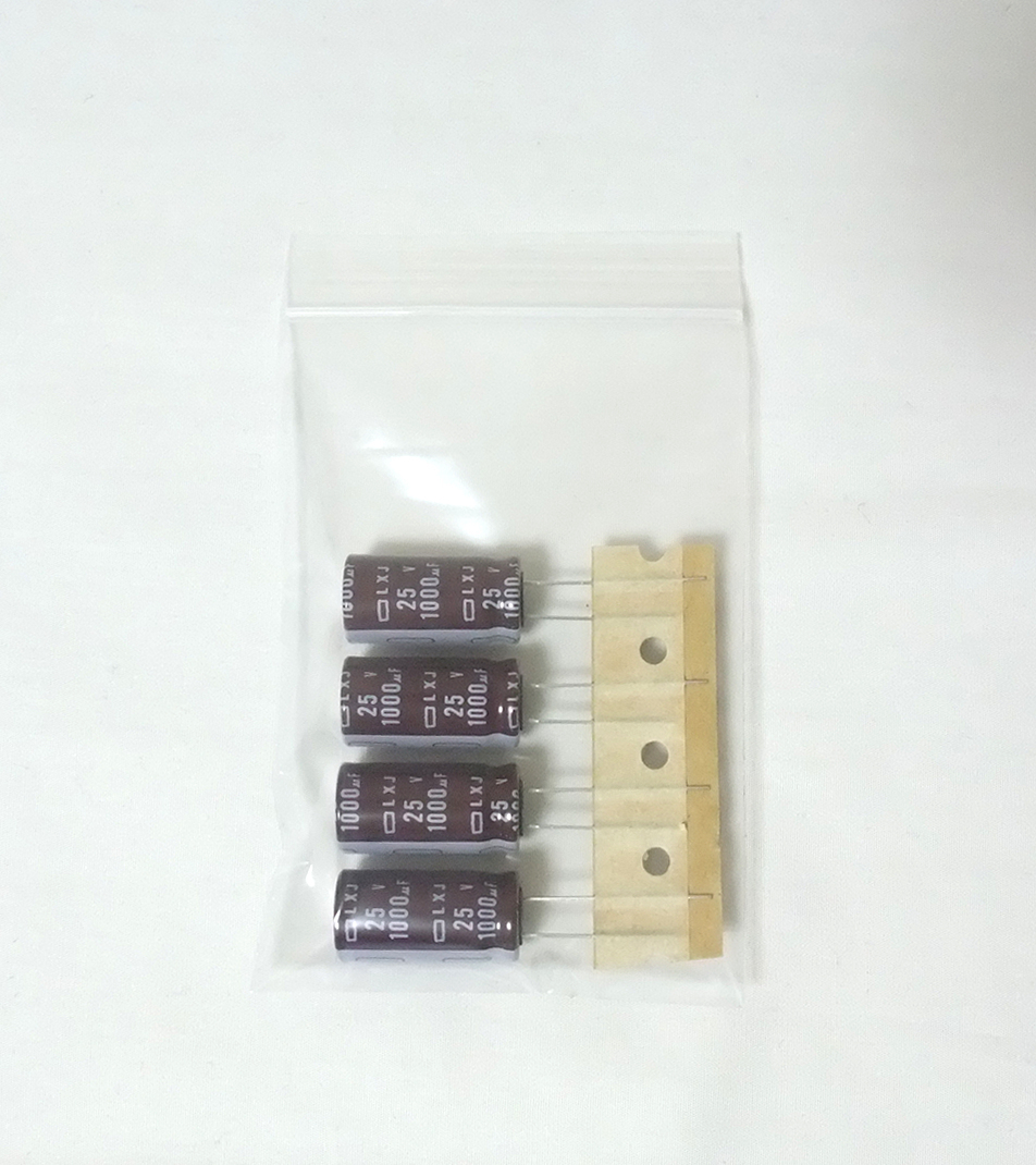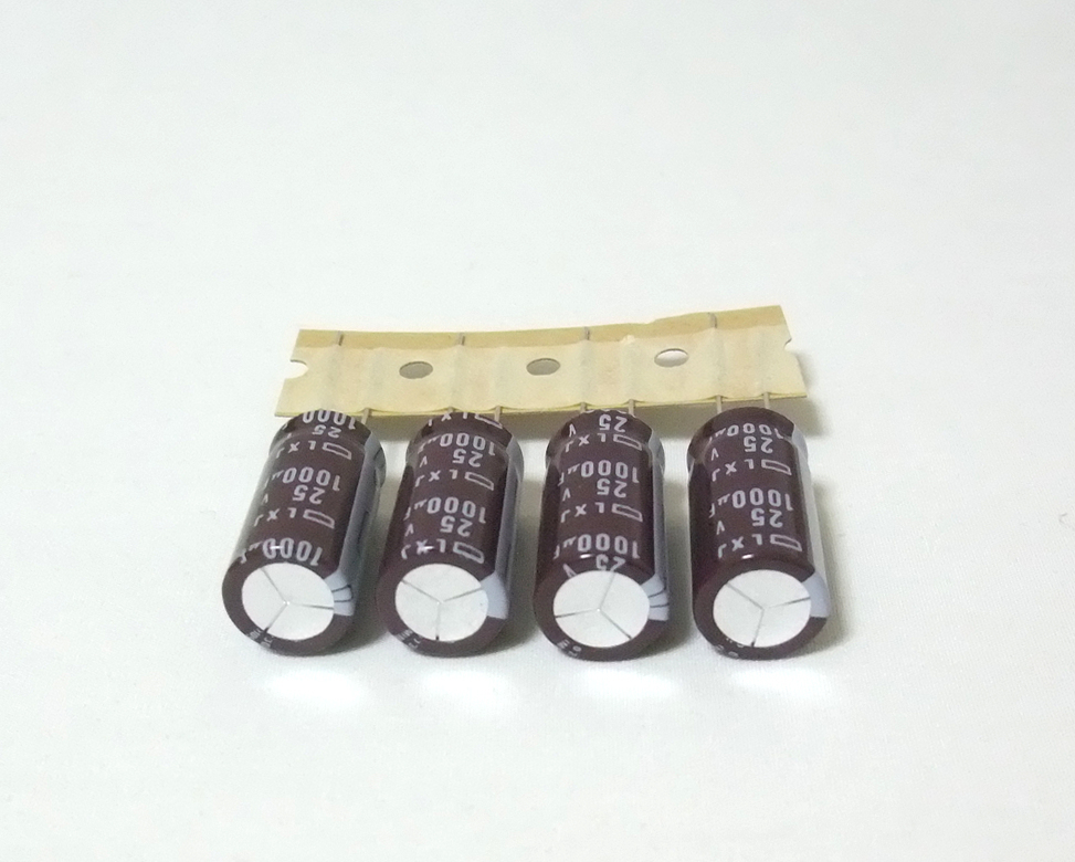 日本ケミコン製アルミ電解コンデンサ1000μF(ELXJ250ETD102MK25S、25V、4個セット、LXJシリーズ、新品)です。