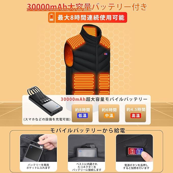 ・バッテリー容量:30000mAh(最長約8時間連続使用可能)