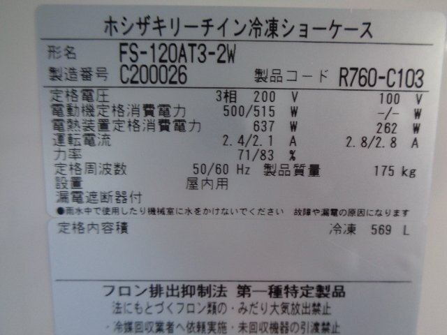 ■2023年 星崎◆リーチイン冷凍ショーケース 1200×650/100V 3相200V◆FS-120AT3-2W■sh349