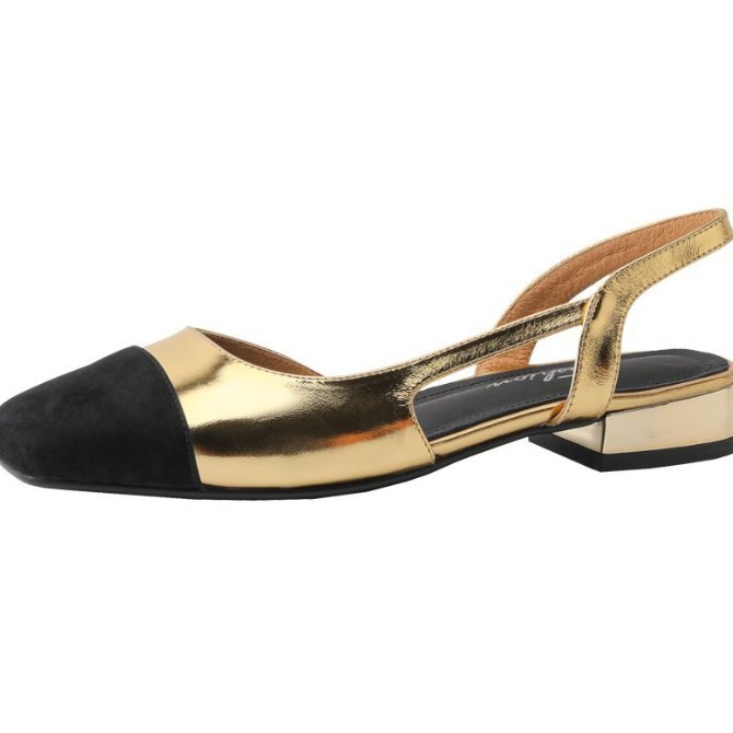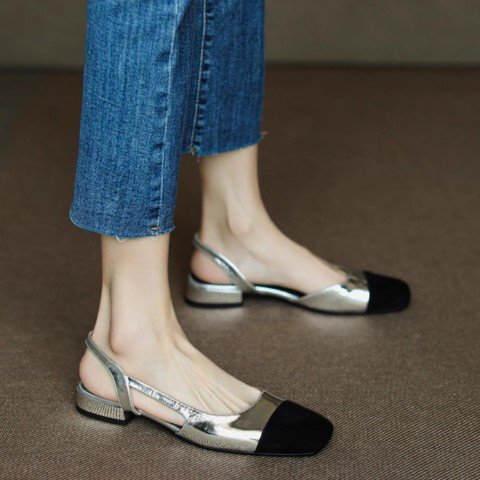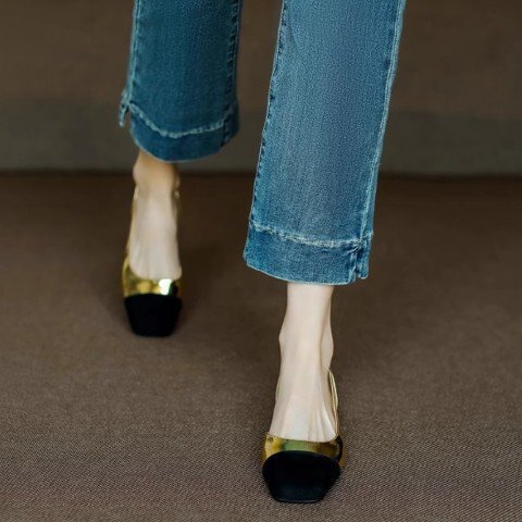 ・薄めのシャープなスクエアトゥのきれいなパンプス。