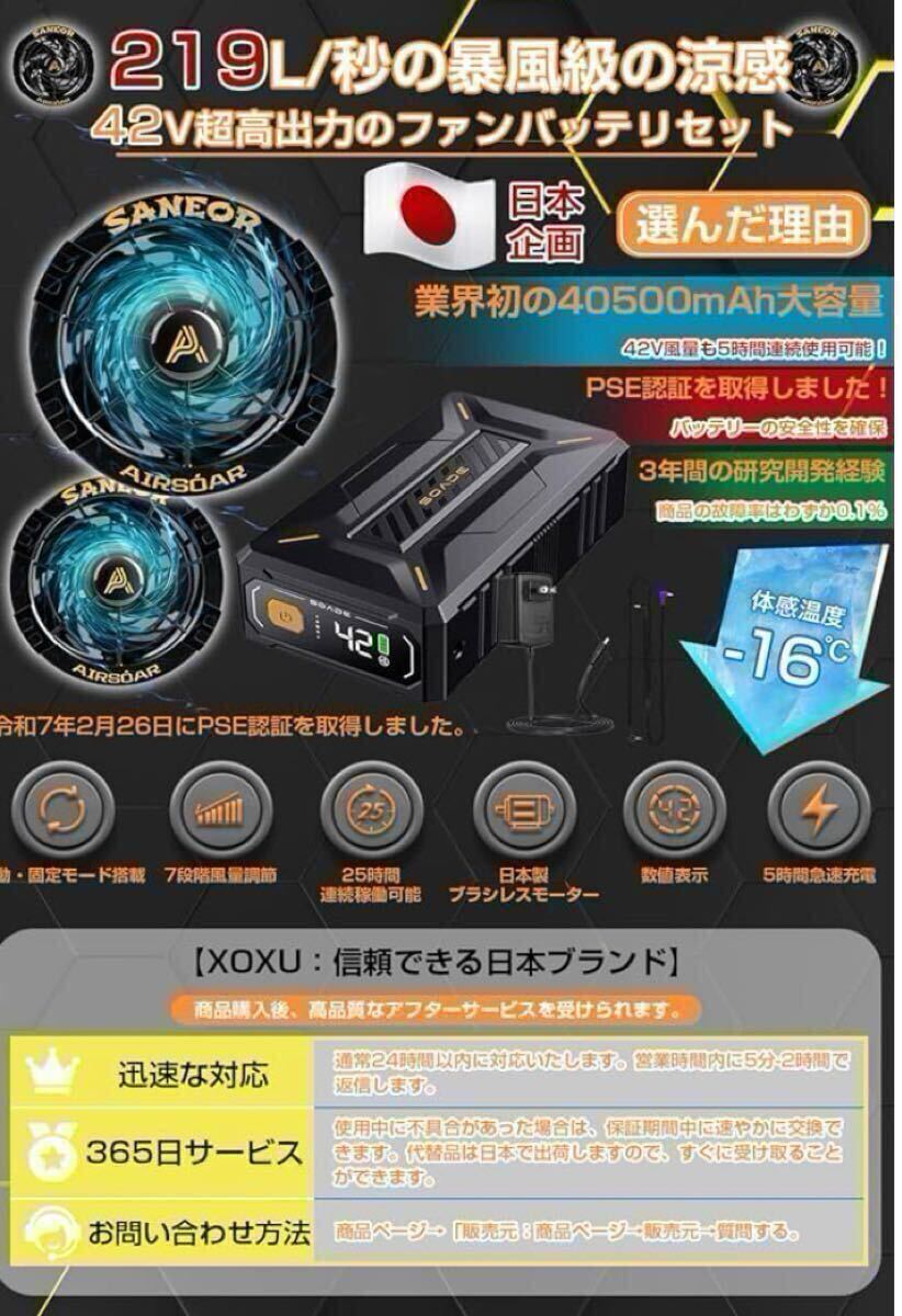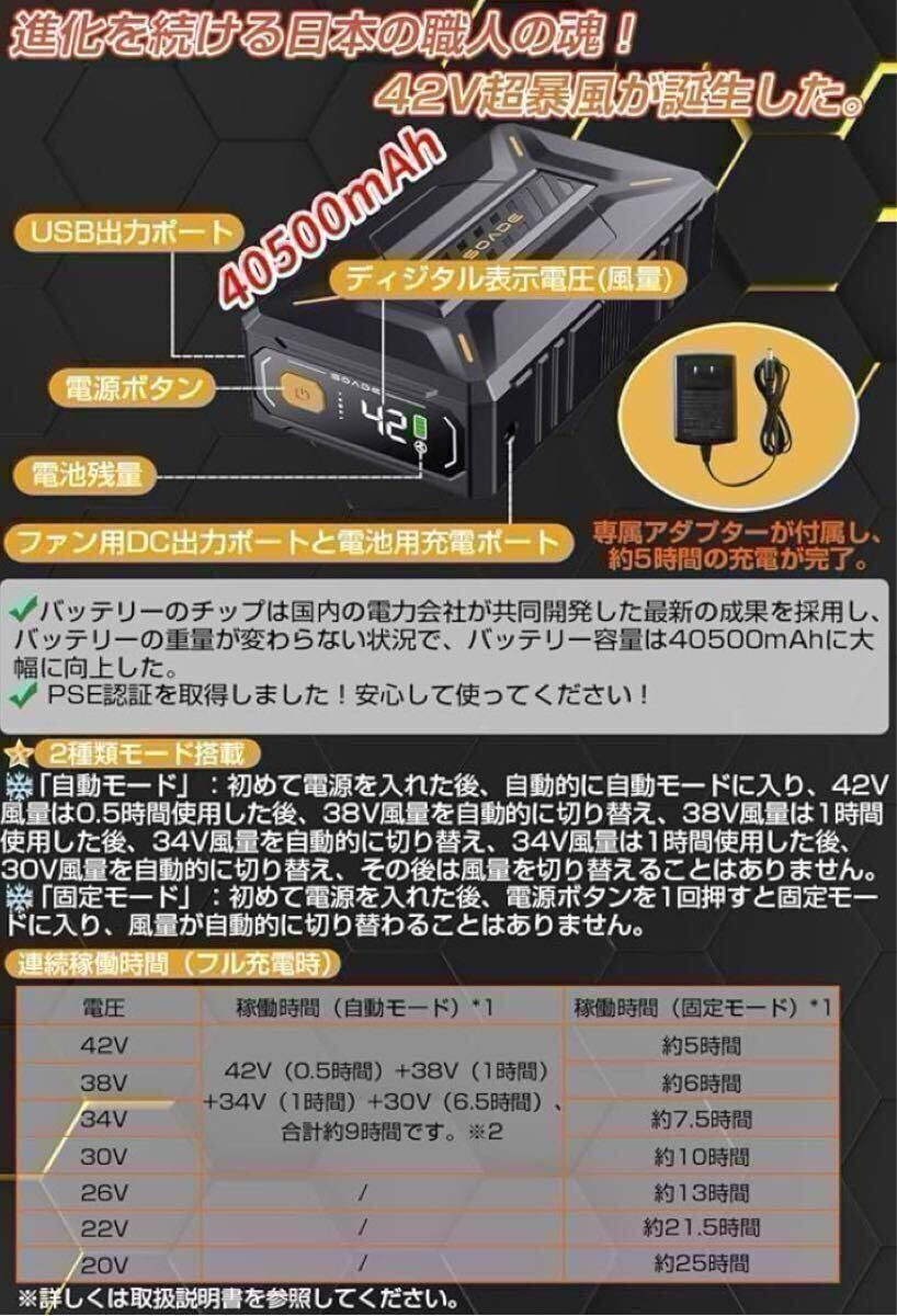 この付属のバッテリーは高性能で40500mAhの大容量を誇り、42Vの場合でも5時間ご使用いただけます!稼働時間:自動モード:9時間、38V:6時間、34V:7.5時間、30V:10時間、26V:13時間、22V:21時間、20V:25時間。もちろん、安全性についてはPSE認証を取得済みですので、安心してご使用ください。